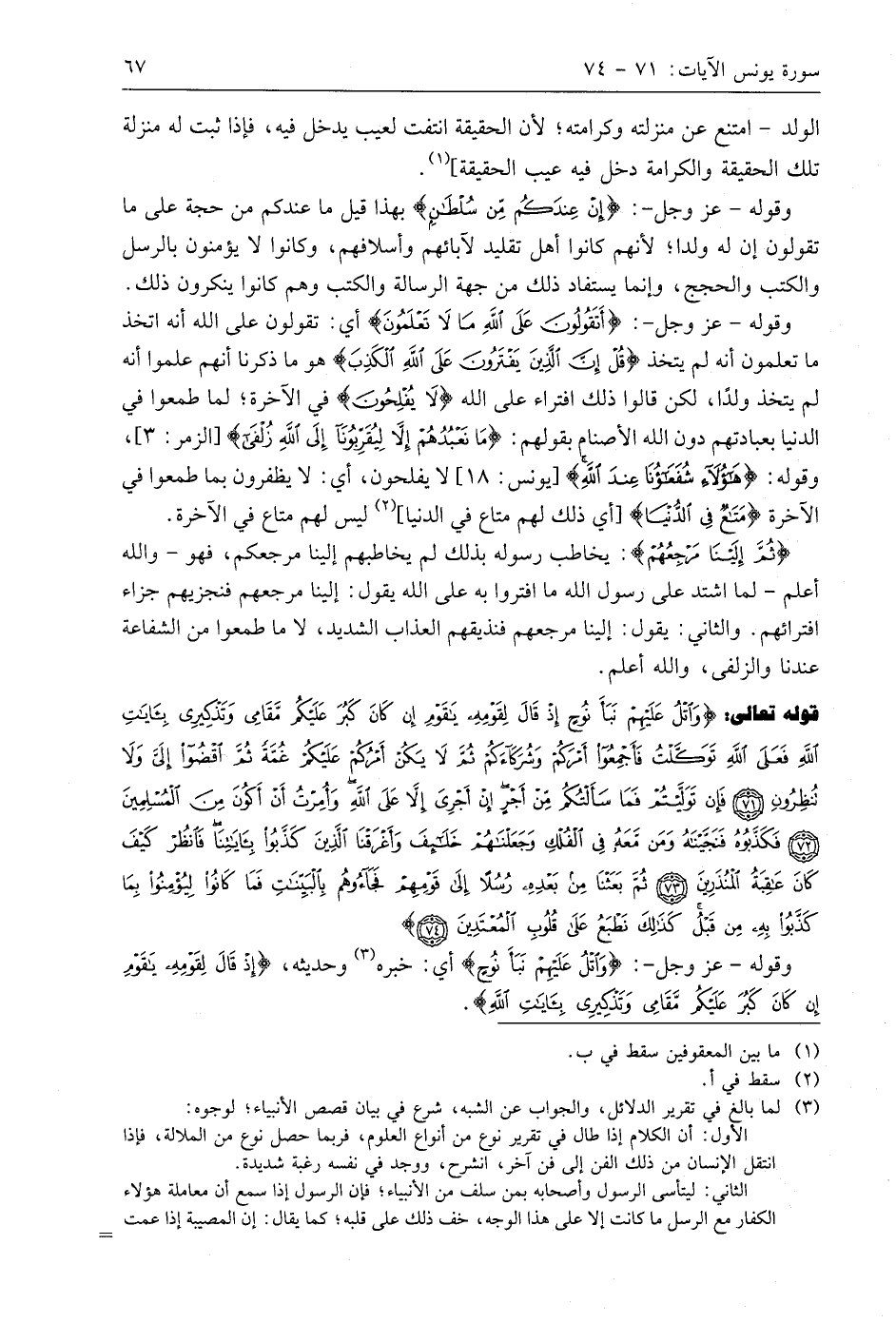 وقوله - عَزَّ وَجَلَّ -: (أَتَقُولُونَ عَلَى اللَّهِ مَا لَا تَعْلَمُونَ) أي: تقولون على اللَّه أنه اتخذ ما تعلمون أنه لم يتخذ (قُلْ إِنَّ الَّذِينَ يَفْتَرُونَ عَلَى اللَّهِ الْكَذِبَ لَا يُفْلِحُونَ (69) هو ما ذكرنا أنهم علموا أنه لم يتخذ ولدًا، لكن قالوا ذلك افتراء على اللَّه (لَا يُفْلِحُونَ) في الآخرة؛ لما طمعوا في الدنيا بعبادتهم دون اللَّه الأصنام بقولهم: (مَا نَعْبُدُهُمْ إِلَّا لِيُقَرِّبُونَا إِلَى اللَّهِ زُلْفَى). وقوله: (هَؤُلَاءِ شُفَعَاؤُنَا عِندَ اللَّهِ)، لا يفلحون، أي: لا يظفرون بما طمعوا في الآخرة (مَتَاعٌ فِي الدُّنْيَا ثُمَّ إِلَيْنَا مَرْجِعُهُمْ ثُمَّ نُذِيقُهُمُ الْعَذَابَ الشَّدِيدَ بِمَا كَانُوا يَكْفُرُونَ (70) أي ذلك لهم متاع في الدنيا، ليس لهم متاع في الآخرة.