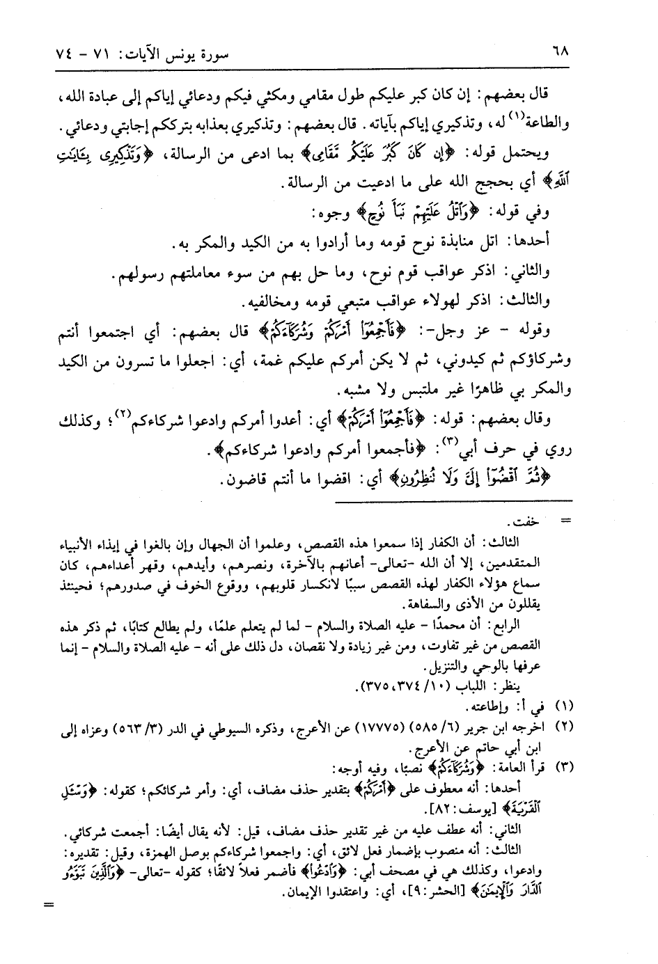 وقوله - عَزَّ وَجَلَّ -؛ (فَأَجْمِعُوا أَمْرَكُمْ وَشُرَكَاءَكُمْ) قَالَ بَعْضُهُمْ: أي اجتمعوا أنتم وشركاؤكم ثم كيدوني، ثم لا يكن أمركم عليكم غمة، أي: اجعلوا ما تسرون من الكيد والمكر بي ظاهرًا غير ملتبس ولا مشبه.