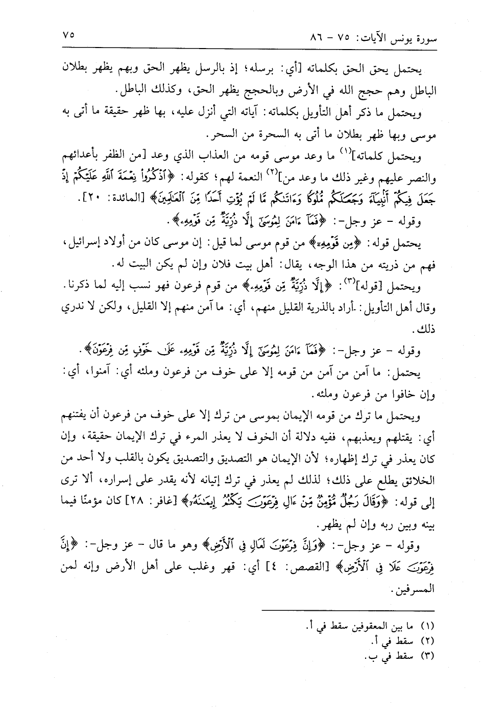 وقوله - عَزَّ وَجَلَّ -: (فَمَا آمَنَ لِمُوسَى إِلَّا ذُرِّيَّةٌ مِنْ قَوْمِهِ عَلَى خَوْفٍ مِنْ فِرْعَوْنَ وَمَلَإِهِمْ أَنْ يَفْتِنَهُمْ وَإِنَّ فِرْعَوْنَ لَعَالٍ فِي الْأَرْضِ وَإِنَّهُ لَمِنَ الْمُسْرِفِينَ (83)