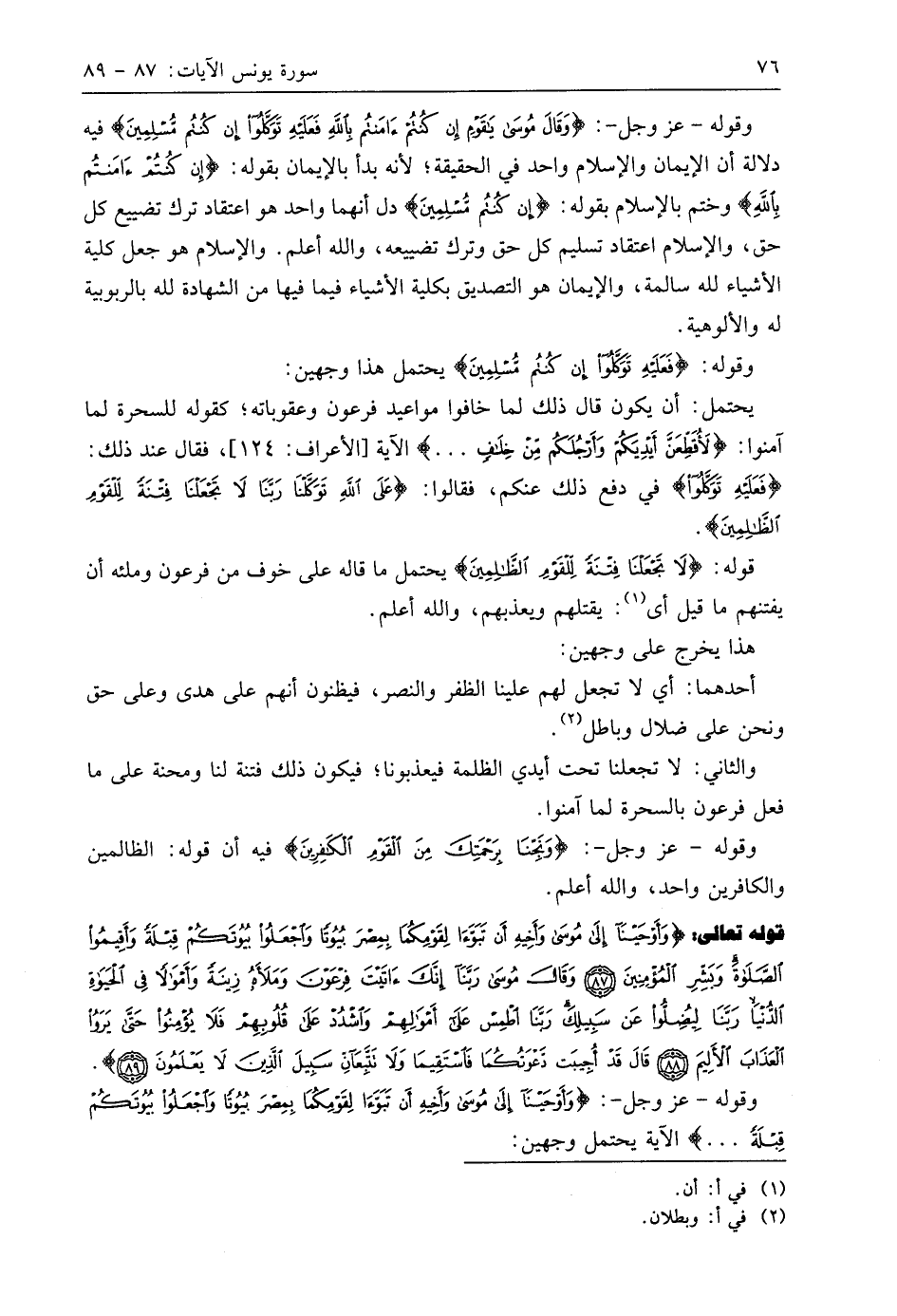 وقوله - عَزَّ وَجَلَّ -: (وَنَجِّنَا بِرَحْمَتِكَ مِنَ الْقَوْمِ الْكَافِرِينَ (86) فيه أن قوله: الظالمين والكافرين واحد، واللَّه أعلم.