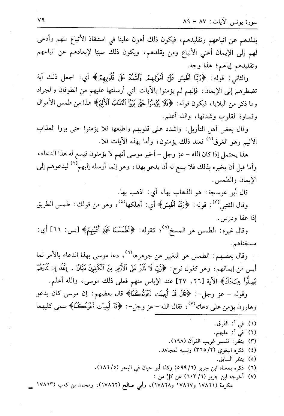وقَالَ بَعْضُهُمْ: الطمس هو التغيير عن جوهرها، دعا موسى بهذا الدعاء بالأمر لما أيس من إيمانهم؛ وهو كقول نوح: (رَبِّ لَا تَذَرْ عَلَى الْأَرْضِ مِنَ الْكَافِرِينَ دَيَّارًا (26) إِنَّكَ إِنْ تَذَرْهُمْ يُضِلُّوا عِبَادَكَ) الآية، عند الإياس منهم فعلى ذلك موسى، واللَّه أعلم.