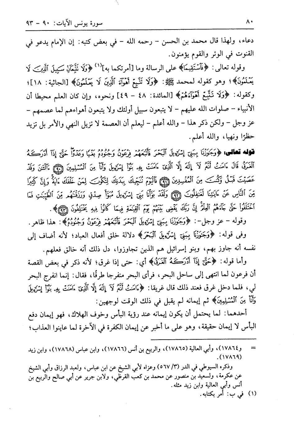 قوله تعالى: (وَجَاوَزْنَا بِبَنِي إِسْرَائِيلَ الْبَحْرَ فَأَتْبَعَهُمْ فِرْعَوْنُ وَجُنُودُهُ بَغْيًا وَعَدْوًا حَتَّى إِذَا أَدْرَكَهُ الْغَرَقُ قَالَ آمَنْتُ أَنَّهُ لَا إِلَهَ إِلَّا الَّذِي آمَنَتْ بِهِ بَنُو إِسْرَائِيلَ وَأَنَا مِنَ الْمُسْلِمِينَ (90) آلْآنَ وَقَدْ عَصَيْتَ قَبْلُ وَكُنْتَ مِنَ الْمُفْسِدِينَ (91) فَالْيَوْمَ نُنَجِّيكَ بِبَدَنِكَ لِتَكُونَ لِمَنْ خَلْفَكَ آيَةً وَإِنَّ كَثِيرًا مِنَ النَّاسِ عَنْ آيَاتِنَا لَغَافِلُونَ (92) وَلَقَدْ بَوَّأْنَا بَنِي إِسْرَائِيلَ مُبَوَّأَ صِدْقٍ وَرَزَقْنَاهُمْ مِنَ الطَّيِّبَاتِ فَمَا اخْتَلَفُوا حَتَّى جَاءَهُمُ الْعِلْمُ إِنَّ رَبَّكَ يَقْضِي بَيْنَهُمْ يَوْمَ الْقِيَامَةِ فِيمَا كَانُوا فِيهِ يَخْتَلِفُونَ (93)