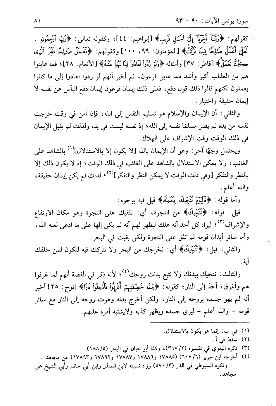وأما قوله: (فَالْيَوْمَ نُنَجِّيكَ بِبَدَنِكَ لِتَكُونَ لِمَنْ خَلْفَكَ آيَةً وَإِنَّ كَثِيرًا مِنَ النَّاسِ عَنْ آيَاتِنَا لَغَافِلُونَ (92) قيل فيه بوجوه: