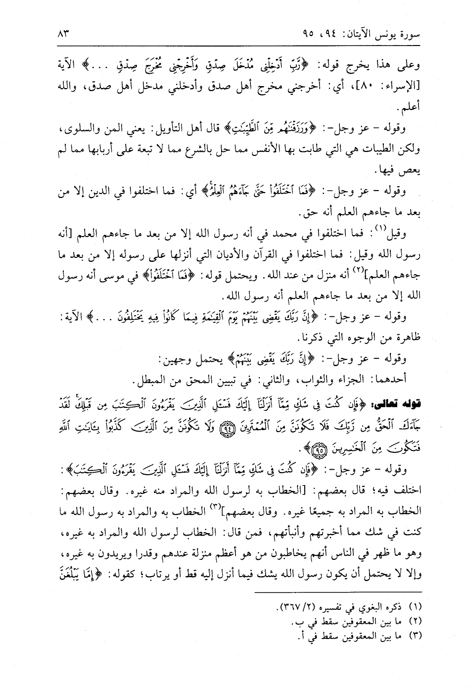 وقوله - عَزَّ وَجَلَّ -: (فَإِنْ كُنْتَ فِي شَكٍّ مِمَّا أَنْزَلْنَا إِلَيْكَ فَاسْأَلِ الَّذِينَ يَقْرَءُونَ الْكِتَابَ): اختلف فيه؛ قَالَ بَعْضُهُمْ: الخطاب به لرسول اللَّه والمراد منه غيره. وقَالَ بَعْضُهُمْ: الخطاب به المراد به جميعًا غيره. وقَالَ بَعْضُهُمْ، الخطاب به والمراد به رسول اللَّه ما كنت في شك مما أخبرتهم وأنبأتهم، فمن قال: الخطاب لرسول اللَّه والمراد به غيره، وهو ما ظهر في الناس أنهم يخاطبون من هو أعظم منزلة عندهم وقَدْرًا ويريدون به غيره، وإلا لا يحتمل أن يكون رسول اللَّه يشك فيما أنزل إليه قط أو يرتاب؛ كقوله: (إِمَّا يَبلُغَنَّ