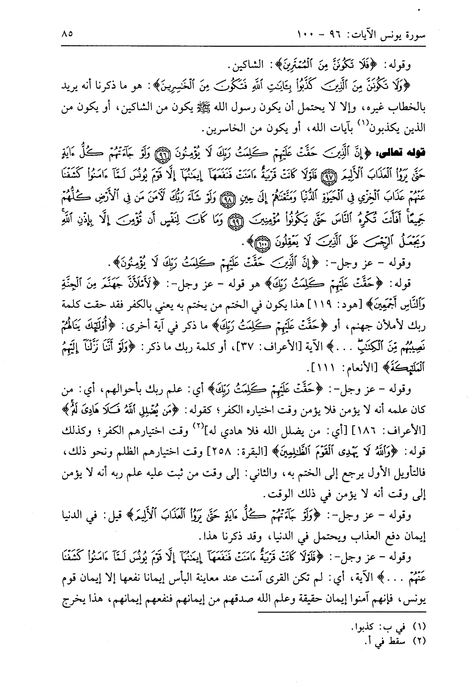 وقوله - عَزَّ وَجَلَّ -: (إِنَّ الَّذِينَ حَقَّتْ عَلَيْهِمْ كَلِمَتُ رَبِّكَ لَا يُؤْمِنُونَ).