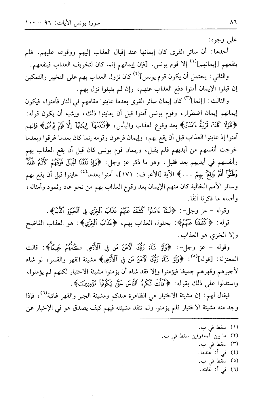 وقوله - عَزَّ وَجَلَّ -: (وَلَوْ شَاءَ رَبُّكَ لَآمَنَ مَنْ فِي الْأَرْضِ كُلُّهُمْ جَمِيعًا أَفَأَنْتَ تُكْرِهُ النَّاسَ حَتَّى يَكُونُوا مُؤْمِنِينَ (99) قالت المعتزلة: قوله: (وَلَوْ شَاءَ رَبُّكَ لَآمَنَ مَنْ فِي الْأَرْضِ) مشيئة القهر والقسر، لو شاء لأجبرهم وقهرهم جميعًا فيؤمنوا وإلا فقد شاء أن يؤمنوا مشيئة الاختيار لكنهم لم يؤمنوا، واستدلوا على ذلك بقوله: (أَفَأَنْتَ تُكْرِهُ النَّاسَ حَتَّى يَكُونُوا مُؤْمِنِينَ).