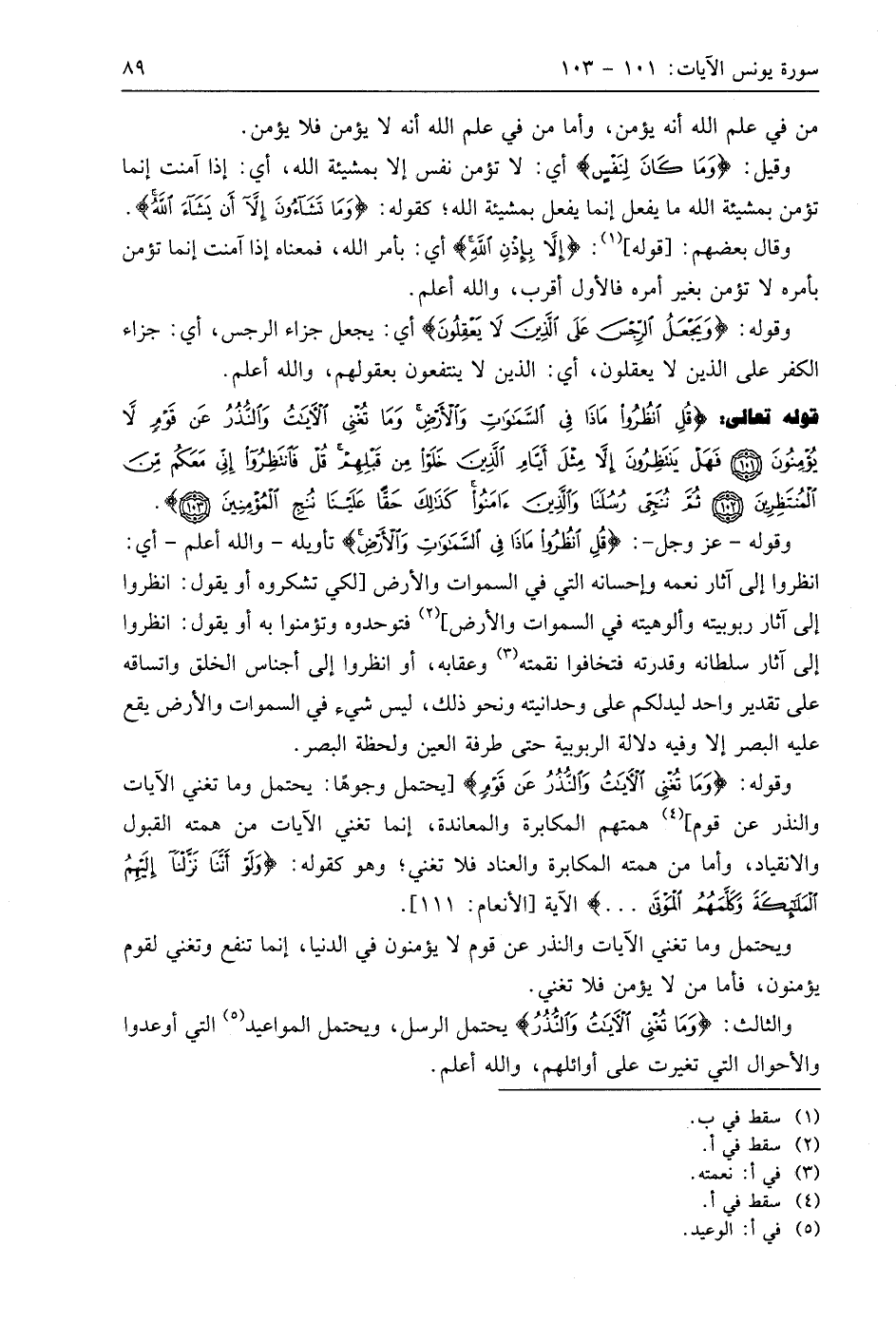 وقيل: (وَمَا كَانَ لِنَفْسٍ) أي: لا تؤمن نفس إلا بمشيئة اللَّه، أي: إذا آمنت إنما تؤمن بمشيئة اللَّه ما يفعل إنما يفعل بمشيئة اللَّه؛ كقوله: (رَمَا لتَثَآءُونَ إِلَّا أَن يشًآءَ اللَّهُ).