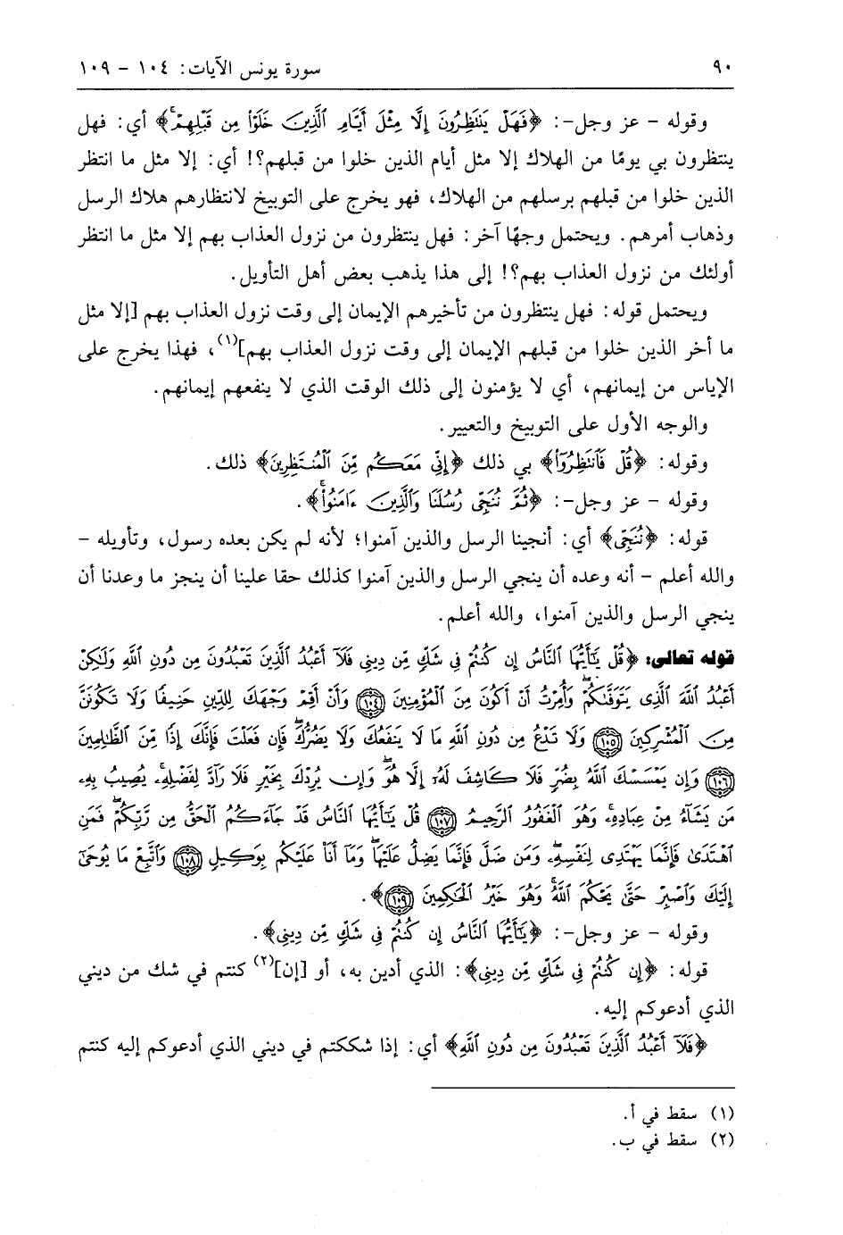 وقوله - عَزَّ وَجَلَّ -: (فَهَلْ يَنْتَظِرُونَ إِلَّا مِثْلَ أَيَّامِ الَّذِينَ خَلَوْا مِنْ قَبْلِهِمْ قُلْ فَانْتَظِرُوا إِنِّي مَعَكُمْ مِنَ الْمُنْتَظِرِينَ (102) أي: فهل ينتظرون بي يومًا من الهلاك إلا مثل أيام الذين خلوا من قبلهم؟! أي: إلا مثل ما انتظر الذين خلوا من قبلهم برسلهم من الهلاك، فهو يخرج على التوبيخ لانتظارهم هلاك الرسل وذهاب أمرهم. ويحتمل وجهًا آخر: فهل ينتظرون من نزول العذاب بهم إلا مثل ما انتظر أُولَئِكَ من نزول العذاب بهم؟! إلى هذا يذهب بعض أهل التأويل.