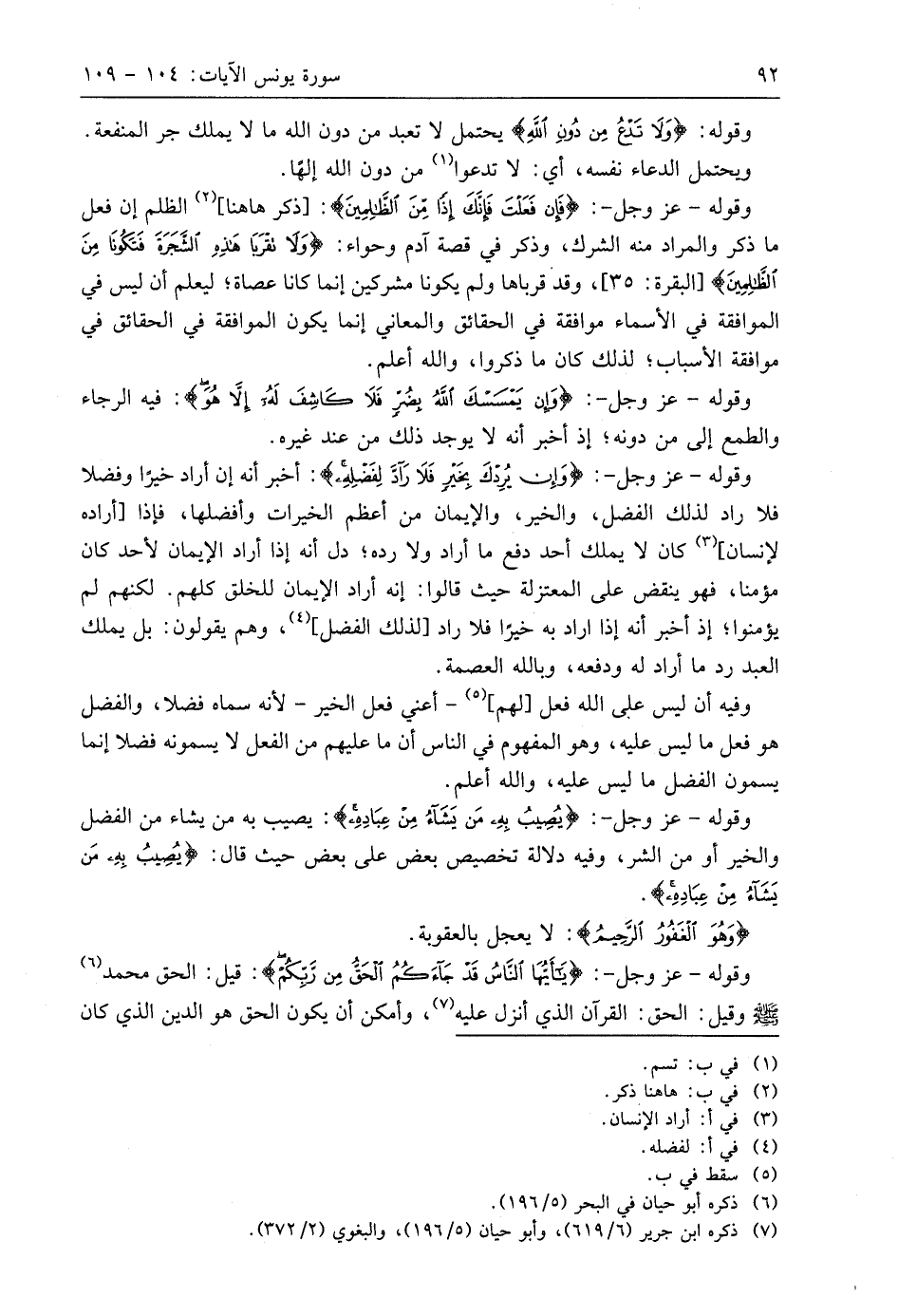 وقوله - عَزَّ وَجَلَّ -: (وَإِنْ يُرِدْكَ بِخَيْرٍ فَلَا رَادَّ لِفَضْلِهِ): أخبر أنه إن أراد خيرًا وفضلا فلا راد لذلك الفضل، والخير، والإيمان من أعظم الخيرات وأفضلها، فإذا أراده لإنسان، كان لا يملك أحد دفع ما أراد ولا رده؛ دل أنه إذا أراد الإيمان لأحد كان مؤمنا، فهو ينقض على المعتزلة حيث قالوا: إنه أراد الإيمان للخلق كلهم. لكنهم لم يؤمنوا؛ إذ أخبر أنه إذا اراد به خيرًا فلا راد لذلك الفضل، وهم يقولون: بل يملك العبد رد ما أراد له ودفعه، وباللَّه العصمة.