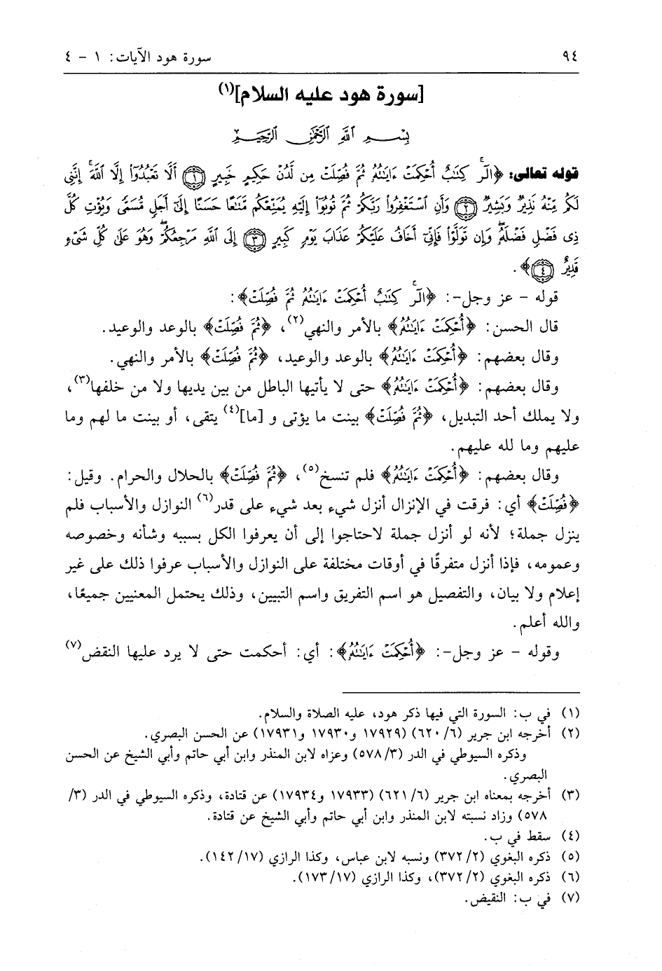 وقوله - عَزَّ وَجَلَّ -: (أُحْكِمَتْ آيَاتُهُ): أي: أحكمت حتى لا يرد عليها النقض