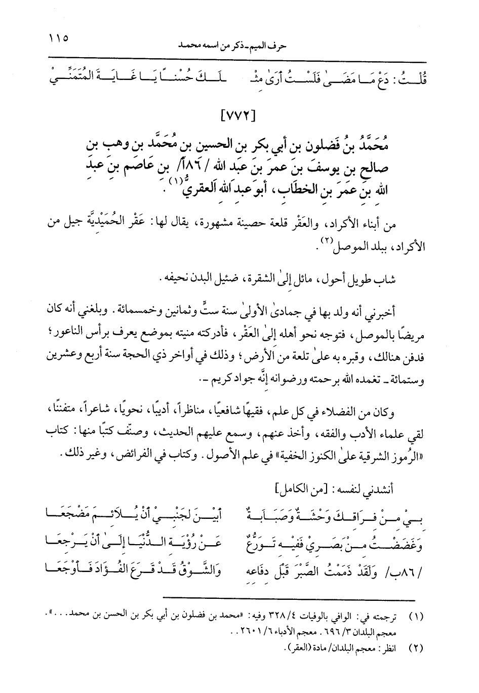 محمَّد بن فضلون بن أبي بكر الحسين بن محمد بن وهب بن صالح بن يوسف بن عمر بن عبد الله /86 أ/ بن عاصم بن عبد الله بن عمر بن الخطاب، أبو عبد الله العقريُّ.
