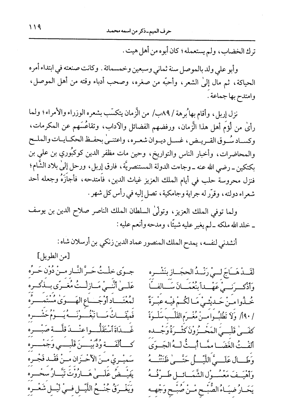 نزل إربل، وأقام بها برهة /89 ب/ من الزمان يتكسّب بشعره الوزراء والأمراء؛ ولما رأى من لؤم أهل هذا الزمان، ورفضهم الفضائل والآداب، وتقاعسهم عن المكرمات، وكساد سوق القريض، غسل ديوان شعرهن واعتنى بحفظ الحكايات والملح والمحاضرات، وأخبار الناس والتواريخ، وحين مات مظفر الدين كوكبوري بن علي بن بكتكين – رضي الله عنه – وجاءت الدولة المستنصرية، فارق إربل، ورحل إلى بلاد الشام؛ فنزل محروسة حلب في أيام الملك العزيز غياث الدين، فامتدحه، فأجازه وجعله أحد شعراء دولته، وقرر له جراية وجامكية، تصل إليه في رأس كل شهر.