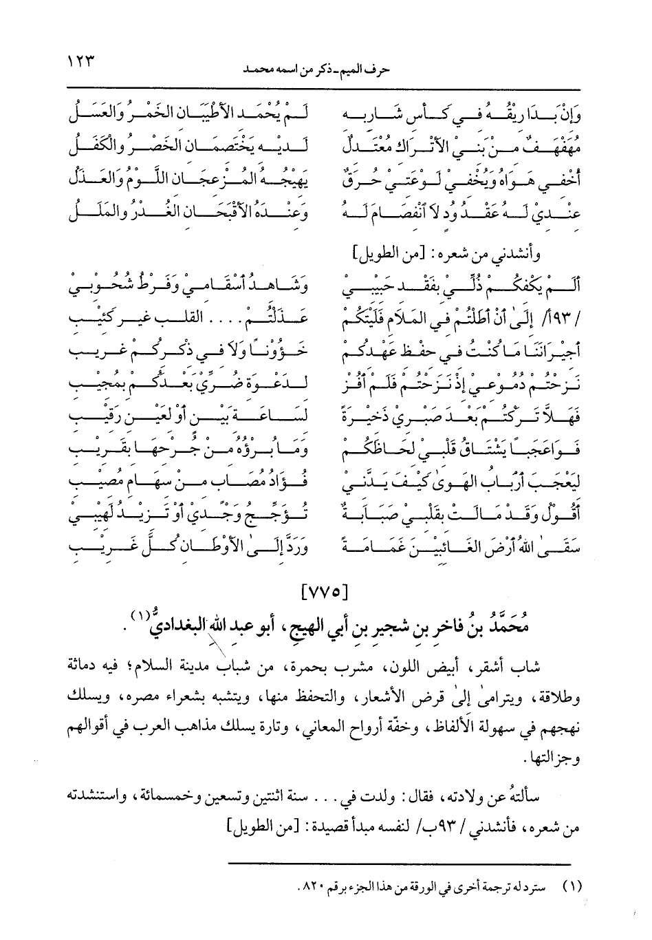 سألته عن ولادته، فقال: ولدت في ... سنة اثنتني وتسعين وخمسمائة، واستئنشدته من شعره، فأنشدني /93 ب/ لنفسه مبدأ قصيدة: [من الطويل]