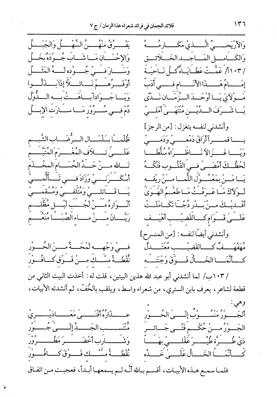 /103 ب/ لما أنشدني أبو عبد الله هذين البيتين، قلت له: أخذت البيت الثاني من قطعة لشاعر، يعرف بابن الستري، من شعراء واسط، ويلقب بالخفّ، ثم أنشدته الأبيات، وهي: