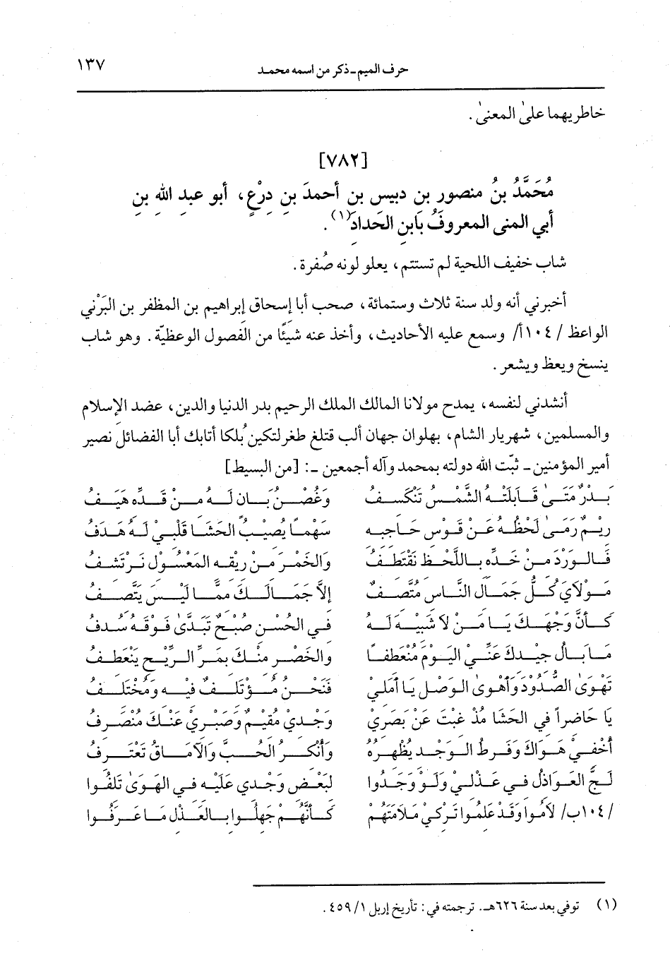 محمد بن منصور بن دبيس بن أحمد بن درعٍ، أبو عبد الله بن أبي المنى المعروف بابن الحداد.