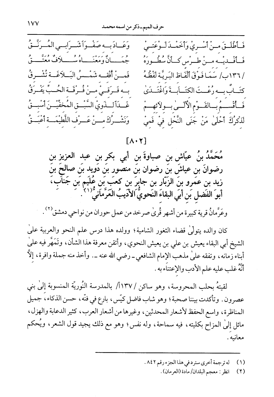 محمَّد بن عيِّاش بن صباوة بن أبي بكر بن عبد العزيز بن رضوان بن عياش بن رضوان بن منصور بن دويد بن صالح بن زيد بن عمرو بن الزبّار بن جابر بن كعب بن عليم بن جناب، أبو الفضل بن أبي البقاء النحوي الأديب العرَّمانيُّ.