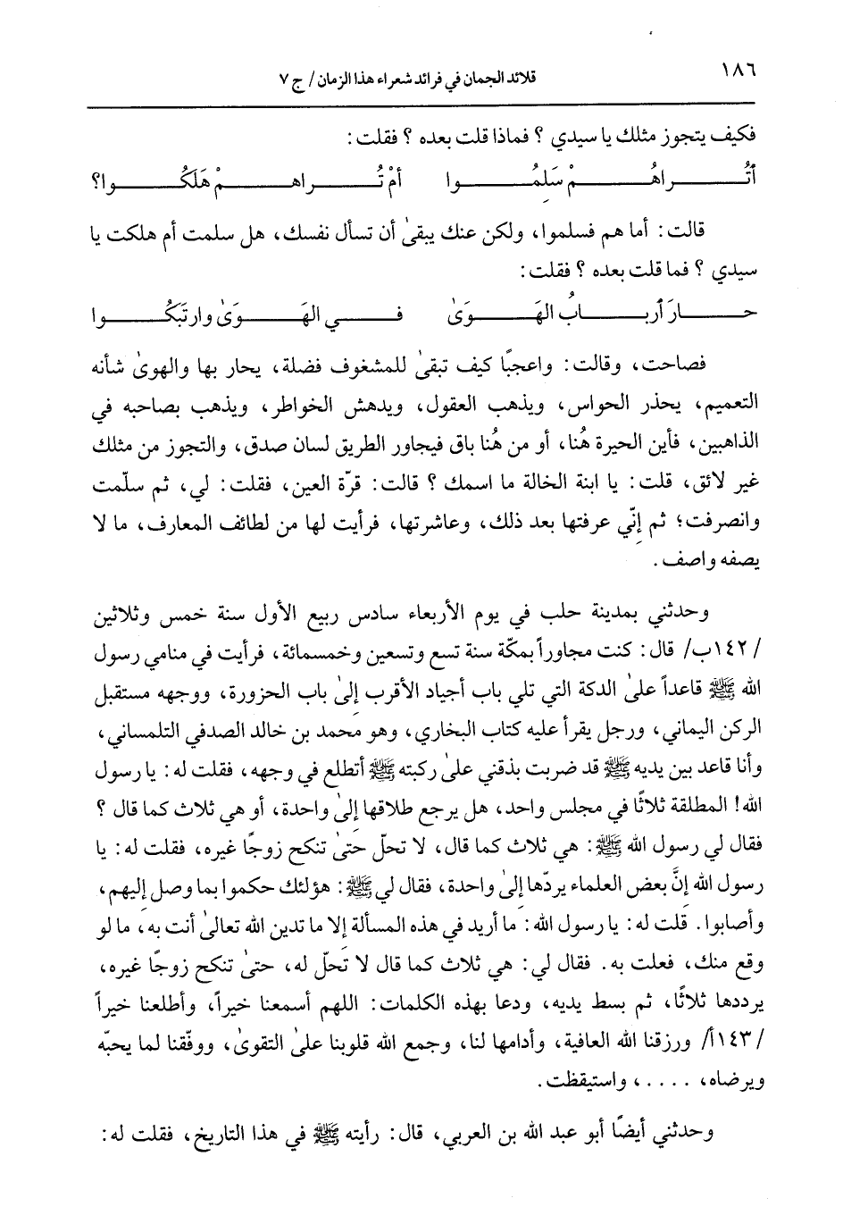 وحدثني بمدينة حلب في يوم الأربعاء سادس ربيع الأول سنة خمس وثلاثين /142 ب/ قال: كنت مجاورًا بمكّة سنة تسع وتسعين وخمسمائة، فرأيت في منامي رسول الله صلى الله عليه وسلم قاعدًا على الدكمة التي تلي باب أجياد الأقرب إلى باب الحزورة، ووجهه مستقبل الركن اليماني، ورجل يقرأ عليه كتاب البخاري، وهو محمد بن خالد الصدفي التلمساني، وأنا قاعد بين يديه صلى الله عليه وسلم قد ضربت بذقني على ركبته صلى الله عليه وسلم أتطلع في وجهه، فقلت له: يا رسول الله! المطلقة ثلاثًا في مجلس واحد، هل يرجع طلاقها إلى واحدة، أو هي ثلاث كما قال؟ فقال لي رسول الله صلى الله عليه وسلم: هي ثلاث كما قال، لا تحلّ حتى تنكح زوجًا غيره، فقلت له: يا رسول الله إنَّ بعض العلماء يردّها إلى واحدة، فقال لي صلى الله عليه وسلم: هؤلئك حكموا بما وصل إليهم، وأصابوا. قلت له: يا رسول الله: ما أريد في هذه المسألة إلا ما تدين الله تعالى أنت به، ما لو وقع منك، فعلت به. فقال لي: هي ثلاث كما قال لا تحلّ له، حتى تنكح زوجًا غيره، يرددها ثلاثًا، ثم بسط يديه، ودعا بهذه الكلمات: اللهم أسمعنا خيرًا، وأطلعنا خيرًا /143 أ/ ورزقنا الله العافية، وأدامها لنا، وجمع الله قلوبنا على التقوى، ووفّقنا لما يحبّه ويرضاه، .... ، واستيقظت.