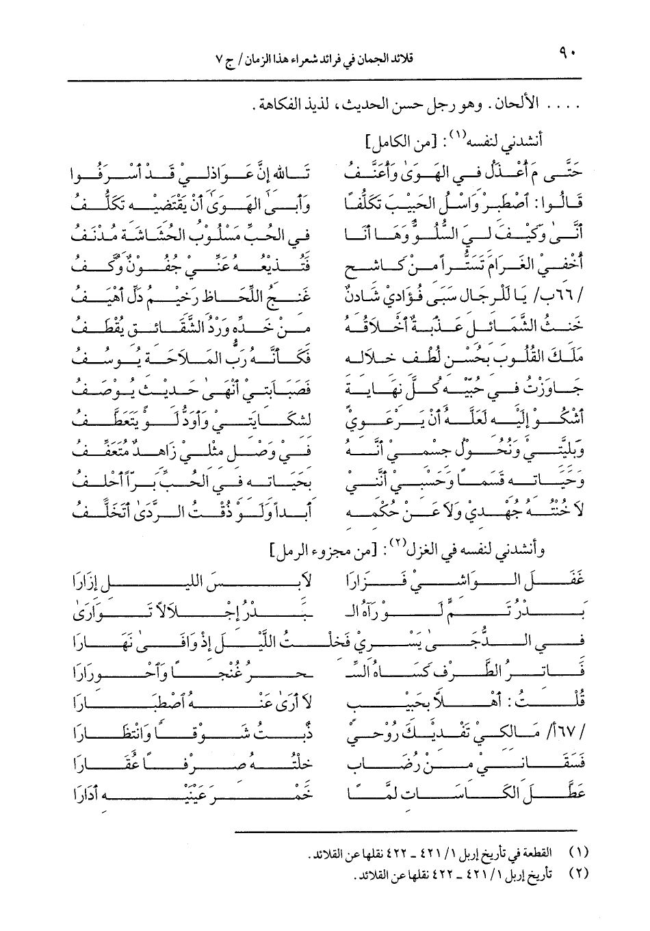 كتاب قلائد الجمان في فرائد شعراء هذا الزمان (اسم الجزء: 6)