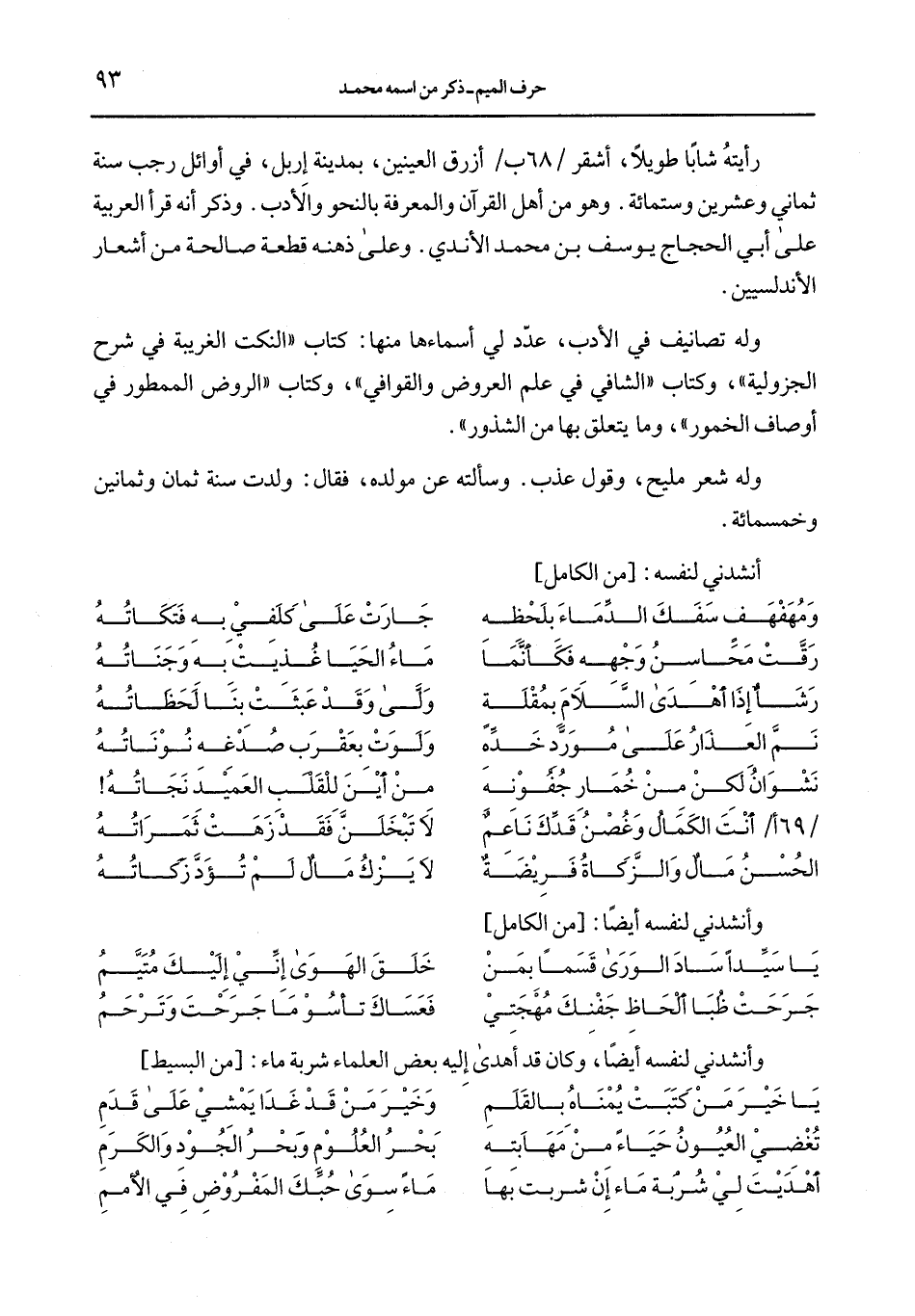 رأيته شاباً طويلاً، أشقر /68 ب/ أزرق العينين، بمدينة إربل، في أوائل رجب سنة ثماني وعشرين وستمائة. وهو من أهل القرآن والمعرفة بالنحو والأدب. وذكر أنه قرأ العربية على أبي الحجاج يوسف بن محمد الأندي. وعلى ذهنه قطعة صالحة من أشعار الندلسيين.