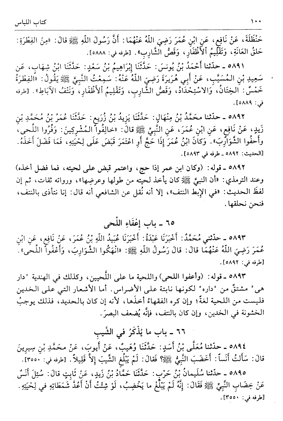 5893 - حَدَّثَنِى مُحَمَّدٌ أَخْبَرَنَا عَبْدَةُ أَخْبَرَنَا عُبَيْدُ اللَّهِ بْنُ عُمَرَ عَنْ نَافِعٍ عَنِ ابْنِ عُمَرَ - رضى الله عنهما - قَالَ قَالَ رَسُولُ اللَّهِ - صلى الله عليه وسلم - «انْهَكُوا الشَّوَارِبَ، وَأَعْفُوا اللِّحَى». طرفه 5892 - تحفة 8047