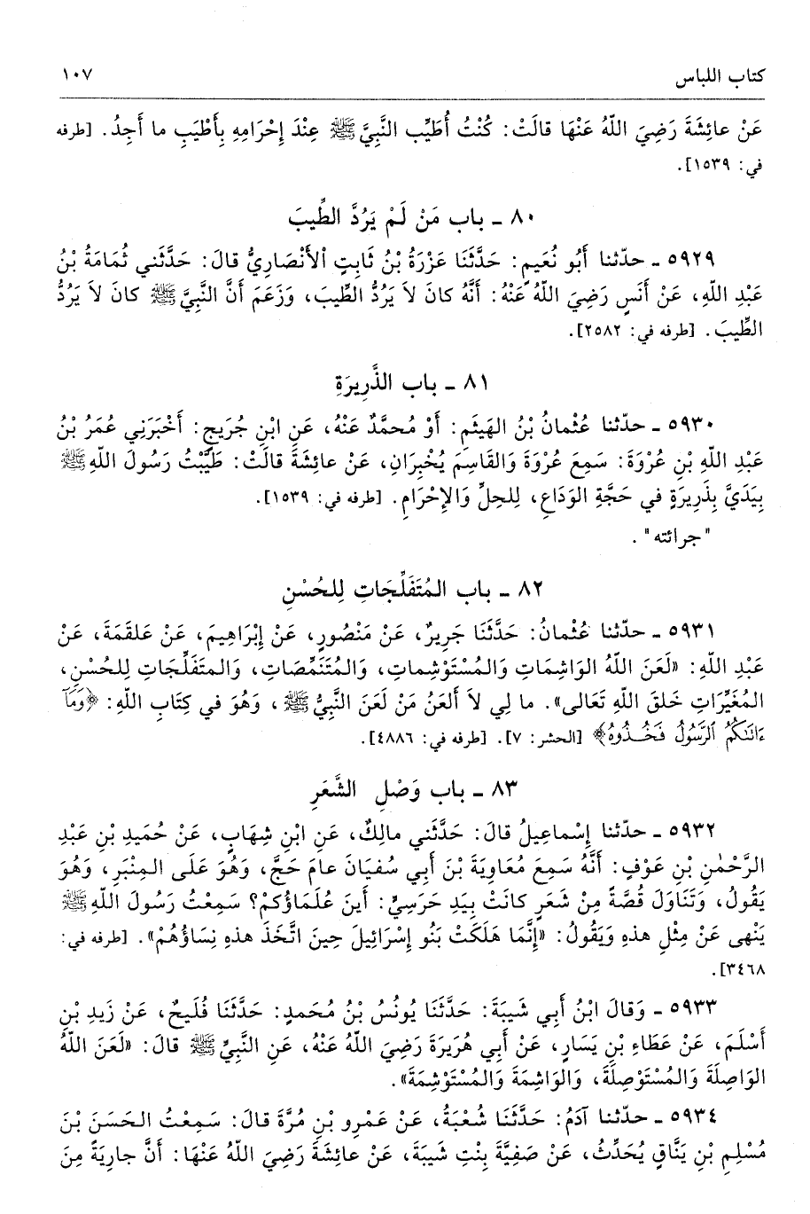 5931 - حَدَّثَنَا عُثْمَانُ حَدَّثَنَا جَرِيرٌ عَنْ مَنْصُورٍ عَنْ إِبْرَاهِيمَ عَنْ عَلْقَمَةَ عَنْ عَبْدِ اللَّهِ لَعَنَ اللَّهُ الْوَاشِمَاتِ، وَالْمُسْتَوْشِمَاتِ، وَالْمُتَنَمِّصَاتِ وَالْمُتَفَلِّجَاتِ لِلْحُسْنِ، الْمُغَيِّرَاتِ خَلْقَ اللَّهِ تَعَالَى، مَالِى لاَ أَلْعَنُ مَنْ لَعَنَ النَّبِىُّ - صلى الله عليه وسلم - وَهْوَ فِى كِتَابِ اللَّهِ {وَمَا آتَاكُمُ الرَّسُولُ فَخُذُوهُ} [الحشر: 7]. أطرافه 4886، 4887، 5939، 5943، 5948 - تحفة 9450
