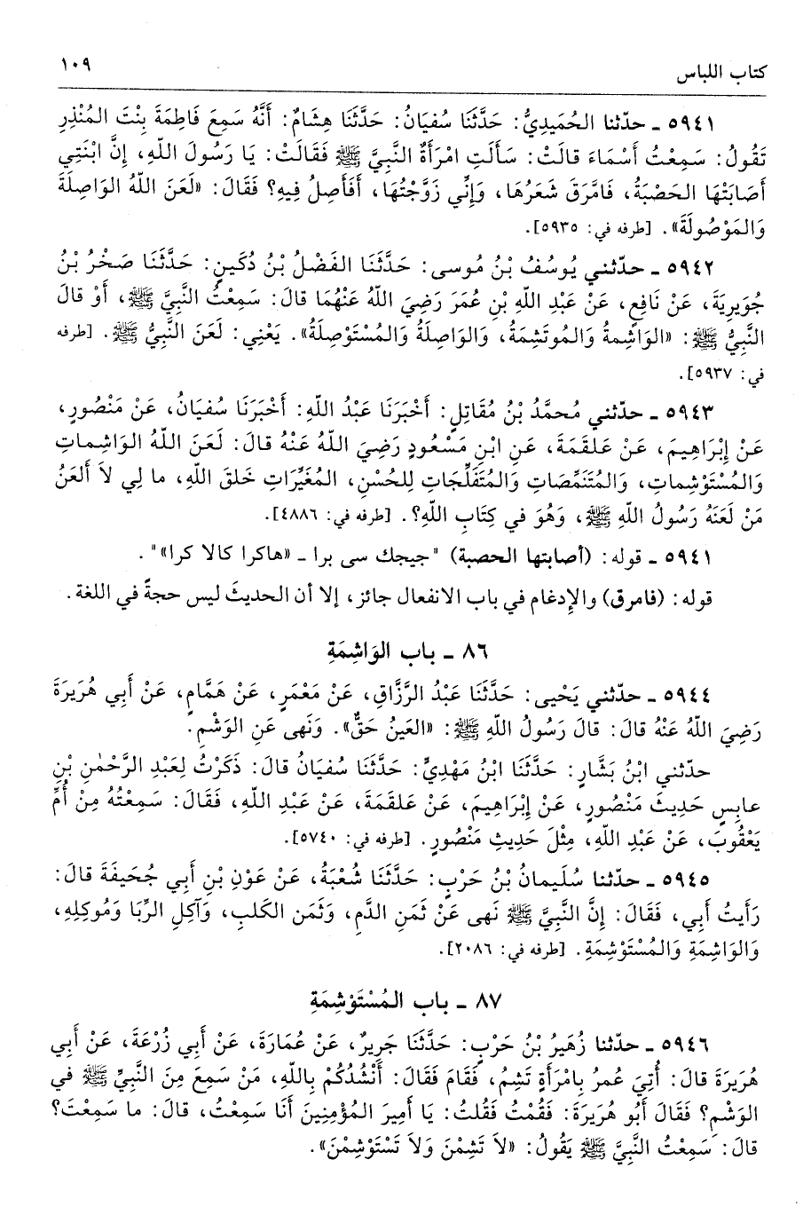 5943 - حَدَّثَنِى مُحَمَّدُ بْنُ مُقَاتِلٍ أَخْبَرَنَا عَبْدُ اللَّهِ أَخْبَرَنَا سُفْيَانُ عَنْ مَنْصُورٍ عَنْ إِبْرَاهِيمَ عَنْ عَلْقَمَةَ عَنِ ابْنِ مَسْعُودٍ - رضى الله عنه - قَالَ لَعَنَ اللَّهُ الْوَاشِمَاتِ، وَالْمُسْتَوْشِمَاتِ، وَالْمُتَنَمِّصَاتِ وَالْمُتَفَلِّجَاتِ لِلْحُسْنِ، الْمُغَيِّرَاتِ خَلْقَ اللَّهِ، مَا لِى لاَ أَلْعَنُ مَنْ لَعَنَهُ رَسُولُ اللَّهِ - صلى الله عليه وسلم - وَهْوَ فِى كِتَابِ اللَّهِ. أطرافه 4886، 4887، 5931، 5939، 5948 - تحفة 9450 - 214/ 7