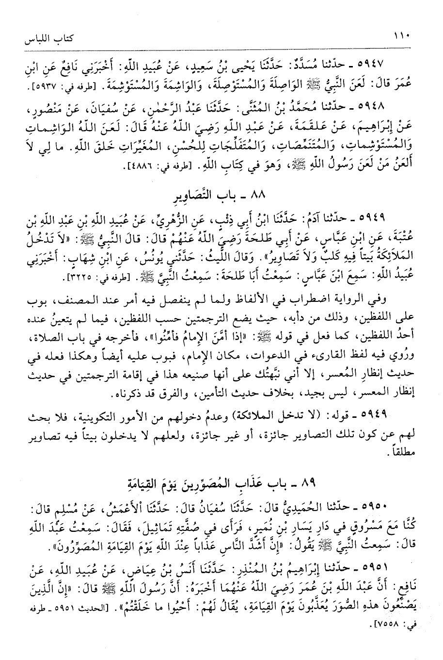 5948 - حَدَّثَنَا مُحَمَّدُ بْنُ الْمُثَنَّى حَدَّثَنَا عَبْدُ الرَّحْمَنِ عَنْ سُفْيَانَ عَنْ مَنْصُورٍ عَنْ إِبْرَاهِيمَ عَنْ عَلْقَمَةَ عَنْ عَبْدِ اللَّهِ - رضى الله عنه - لَعَنَ اللَّهُ الْوَاشِمَاتِ وَالْمُسْتَوْشِمَاتِ، وَالْمُتَنَمِّصَاتِ وَالْمُتَفَلِّجَاتِ لِلْحُسْنِ، الْمُغَيِّرَاتِ خَلْقَ اللَّهِ. مَا لِى لاَ أَلْعَنُ مَنْ لَعَنَ رَسُولُ اللَّهِ - صلى الله عليه وسلم - وَهْوَ فِى كِتَابِ اللَّهِ. أطرافه 4886، 4887، 5931، 5939، 5943 - تحفة 9450
