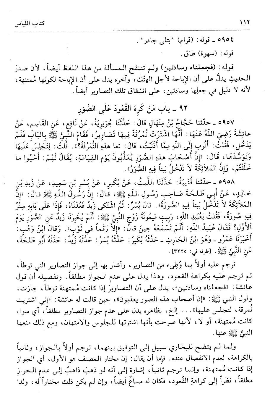 5958 - حَدَّثَنَا قُتَيْبَةُ حَدَّثَنَا اللَّيْثُ عَنْ بُكَيْرٍ عَنْ بُسْرِ بْنِ سَعِيدٍ عَنْ زَيْدِ بْنِ خَالِدٍ عَنْ أَبِى طَلْحَةَ صَاحِبِ رَسُولِ اللَّهِ - صلى الله عليه وسلم - قَالَ إِنَّ رَسُولَ اللَّهِ - صلى الله عليه وسلم - قَالَ «إِنَّ الْمَلاَئِكَةَ لاَ تَدْخُلُ بَيْتًا فِيهِ الصُّورَةُ». قَالَ بُسْرٌ ثُمَّ اشْتَكَى زَيْدٌ فَعُدْنَاهُ، فَإِذَا عَلَى بَابِهِ سِتْرٌ فِيهِ صُورَةٌ فَقُلْتُ لِعُبَيْدِ اللَّهِ رَبِيبِ مَيْمُونَةَ زَوْجِ النَّبِىِّ - صلى الله عليه وسلم - أَلَمْ يُخْبِرْنَا زَيْدٌ عَنِ الصُّوَرِ يَوْمَ الأَوَّلِ. فَقَالَ عُبَيْدُ اللَّهِ أَلَمْ تَسْمَعْهُ حِينَ قَالَ إِلاَّ رَقْمًا فِى ثَوْبٍ. وَقَالَ ابْنُ وَهْبٍ أَخْبَرَنَا عَمْرٌو - هُوَ ابْنُ الْحَارِثِ - حَدَّثَهُ بُكَيْرٌ حَدَّثَهُ بُسْرٌ حَدَّثَهُ زَيْدٌ حَدَّثَهُ أَبُو طَلْحَةَ عَنِ النَّبِىِّ - صلى الله عليه وسلم -. أطرافه 3225، 3226، 3322، 4002، 5949 - تحفة 3775