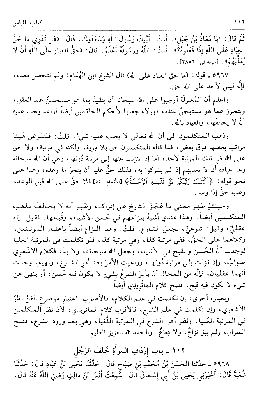 ثُمَّ قَالَ «يَا مُعَاذُ بْنَ جَبَلٍ». قُلْتُ لَبَّيْكَ رَسُولَ اللَّهِ وَسَعْدَيْكَ. فَقَالَ «هَلْ تَدْرِى مَا حَقُّ الْعِبَادِ عَلَى اللَّهِ إِذَا فَعَلُوهُ». قُلْتُ اللَّهُ وَرَسُولُهُ أَعْلَمُ. قَالَ «حَقُّ الْعِبَادِ عَلَى اللَّهِ أَنْ لاَ يُعَذِّبَهُمْ». أطرافه 2856، 6267، 6500، 7373 - تحفة 11308