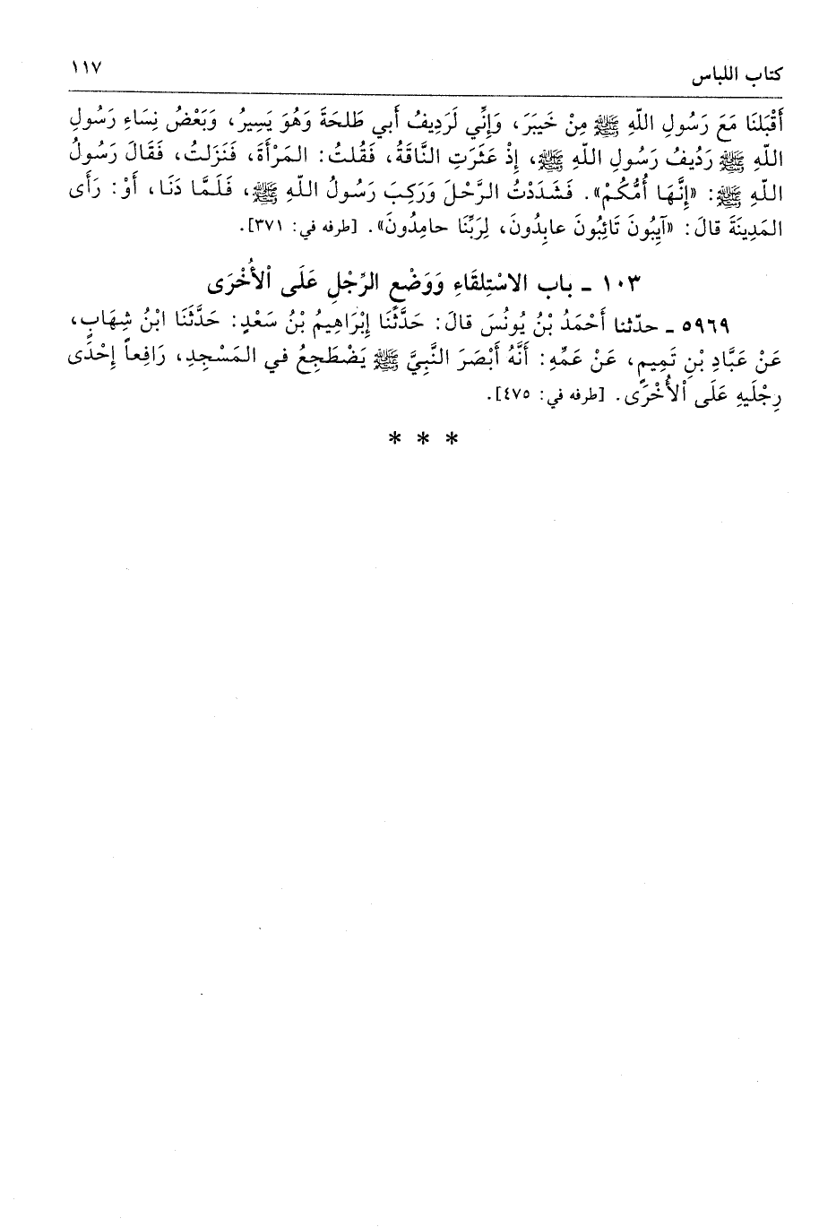 5969 - حَدَّثَنَا أَحْمَدُ بْنُ يُونُسَ حَدَّثَنَا إِبْرَاهِيمُ بْنُ سَعْدٍ حَدَّثَنَا ابْنُ شِهَابٍ عَنْ عَبَّادِ بْنِ تَمِيمٍ عَنْ عَمِّهِ أَنَّهُ أَبْصَرَ النَّبِىَّ - صلى الله عليه وسلم - يَضْطَجِعُ فِى الْمَسْجِدِ، رَافِعًا إِحْدَى رِجْلَيْهِ عَلَى الأُخْرَى. طرفاه 475، 6287 - تحفة 5298