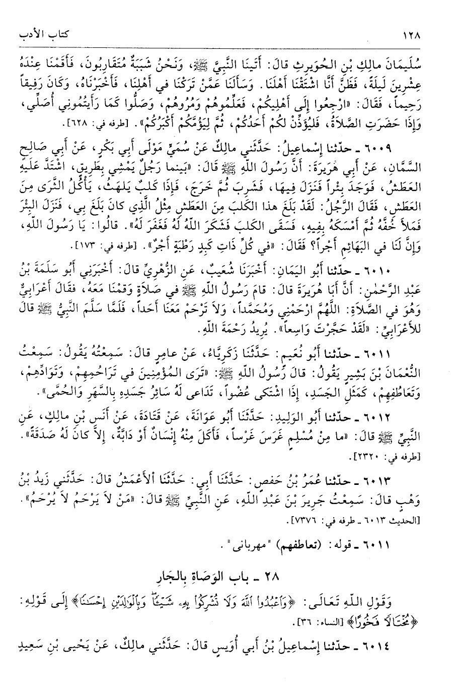 6013 - حَدَّثَنَا عُمَرُ بْنُ حَفْصٍ حَدَّثَنَا أَبِى حَدَّثَنَا الأَعْمَشُ قَالَ حَدَّثَنِى زَيْدُ بْنُ وَهْبٍ قَالَ سَمِعْتُ جَرِيرَ بْنَ عَبْدِ اللَّهِ عَنِ النَّبِىِّ - صلى الله عليه وسلم - قَالَ «مَنْ لاَ يَرْحَمُ لاَ يُرْحَمُ». طرفه 7376 - تحفة 3211