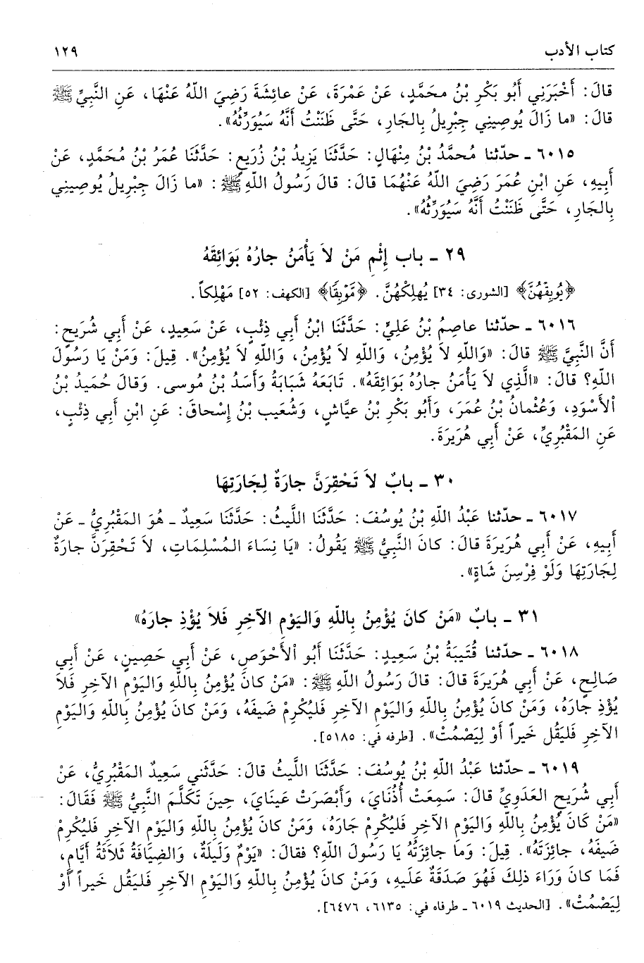 31 - باب «مَنْ كَانَ يُؤْمِنُ بِاللَّهِ وَالْيَوْمِ الآخِرِ فَلاَ يُؤْذِ جَارَهُ»