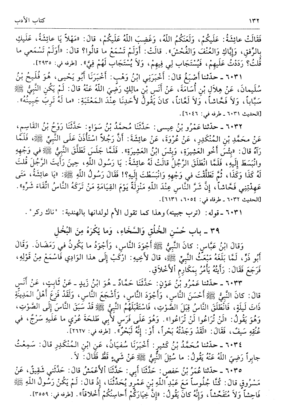 6035 - حَدَّثَنَا عُمَرُ بْنُ حَفْصٍ حَدَّثَنَا أَبِى حَدَّثَنَا الأَعْمَشُ قَالَ حَدَّثَنِى شَقِيقٌ عَنْ مَسْرُوقٍ قَالَ كُنَّا جُلُوسًا مَعَ عَبْدِ اللَّهِ بْنِ عَمْرٍو يُحَدِّثُنَا إِذْ قَالَ لَمْ يَكُنْ رَسُولُ اللَّهِ - صلى الله عليه وسلم - فَاحِشًا وَلاَ مُتَفَحِّشًا، وَإِنَّهُ كَانَ يَقُولُ «إِنَّ خِيَارَكُمْ أَحَاسِنُكُمْ أَخْلاَقًا». أطرافه 3559، 3759، 6029 - تحفة 8933