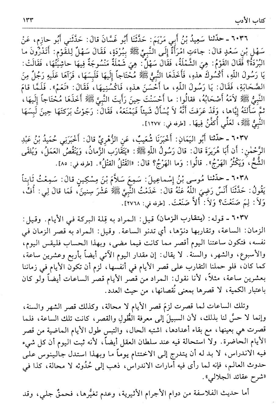 6037 - قوله: (يتقارب الزمان) قيل: المراد به قِلة البركة في الأيام. وقيل: الزمان: الساعة، وتقاربها دنوّها، أي تدنو الساعة. وقيل: المراد به قصر الزمان في نفسه، فتكون ساعتنا اليوم أقصر مما كانت فيما مضى، وبهذا الحساب فليقس اليوم، والأسبوع، والشهر، والسنة. لا يقال: إن مقدار اليوم الآتي أيضًا بأربع وعشرين ساعة، كما كان، فلو حملنا التقارب على قصر الأيام في أنفسها، لزم أن تكون الأيام في زماننا بعشرين ساعة، مثلًا، لأنا نقول: المراد من قصر الأيام قصر الساعات أيضًا ولو كان باعتبار الكمية، لا قصرها بمعنى نُقصانها، من حيث العدد.
