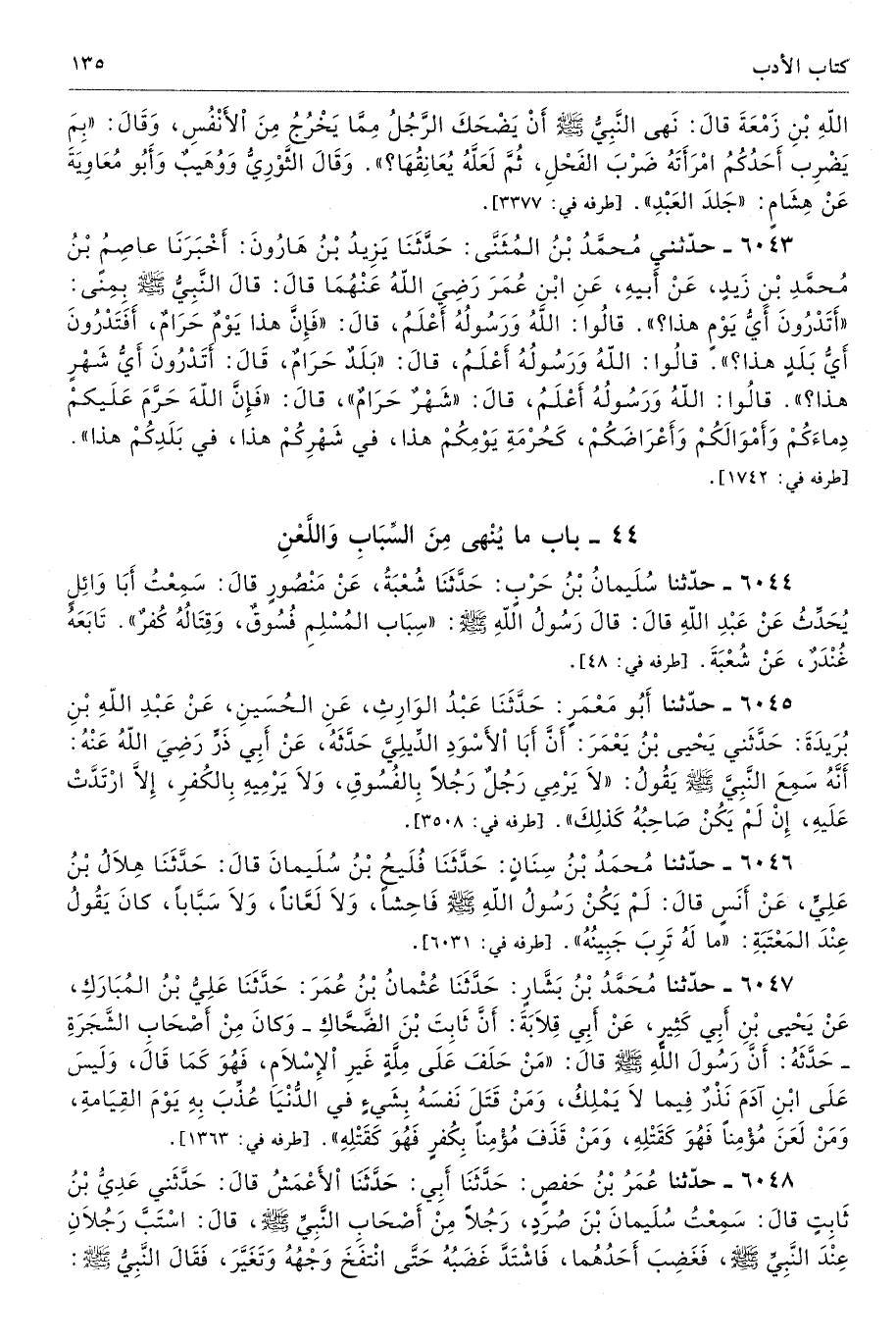 6043 - حَدَّثَنِى مُحَمَّدُ بْنُ الْمُثَنَّى حَدَّثَنَا يَزِيدُ بْنُ هَارُونَ أَخْبَرَنَا عَاصِمُ بْنُ مُحَمَّدِ بْنِ زَيْدٍ عَنْ أَبِيهِ عَنِ ابْنِ عُمَرَ رضى الله عنهما قَالَ قَالَ النَّبِىُّ - صلى الله عليه وسلم - بِمِنًى «أَتَدْرُونَ أَىُّ يَوْمٍ هَذَا». قَالُوا اللَّهُ وَرَسُولُهُ أَعْلَمُ. قَالَ «فَإِنَّ هَذَا يَوْمٌ حَرَامٌ، أَفَتَدْرُونَ أَىُّ بَلَدٍ هَذَا». قَالُوا اللَّهُ وَرَسُولُهُ أَعْلَمُ. قَالَ «بَلَدٌ حَرَامٌ، أَتَدْرُونَ أَىُّ شَهْرٍ هَذَا». قَالُوا اللَّهُ وَرَسُولُهُ أَعْلَمُ. قَالَ «شَهْرٌ حَرَامٌ». قَالَ «فَإِنَّ اللَّهَ حَرَّمَ عَلَيْكُمْ دِمَاءَكُمْ وَأَمْوَالَكُمْ وَأَعْرَاضَكُمْ، كَحُرْمَةِ يَوْمِكُمْ هَذَا فِى شَهْرِكُمْ هَذَا فِى بَلَدِكُمْ هَذَا». أطرافه 1742، 4403، 6166، 6785، 6868، 7077 - تحفة 7418