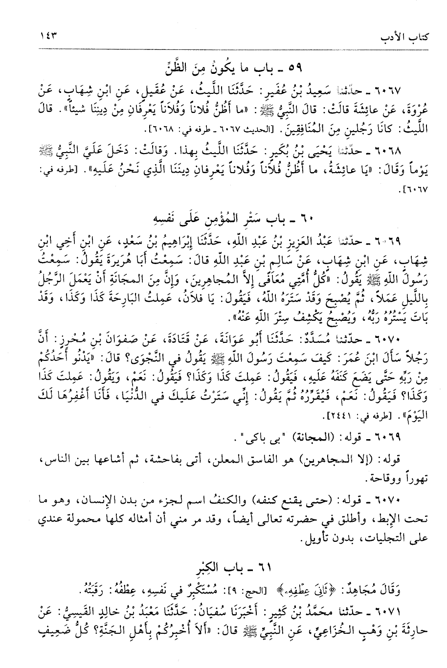 6069 - حَدَّثَنَا عَبْدُ الْعَزِيزِ بْنُ عَبْدِ اللَّهِ حَدَّثَنَا إِبْرَاهِيمُ بْنُ سَعْدٍ عَنِ ابْنِ أَخِى ابْنِ شِهَابٍ عَنِ ابْنِ شِهَابٍ عَنْ سَالِمِ بْنِ عَبْدِ اللَّهِ قَالَ سَمِعْتُ أَبَا هُرَيْرَةَ يَقُولُ سَمِعْتُ رَسُولَ اللَّهِ - صلى الله عليه وسلم - يَقُولُ «كُلُّ أُمَّتِى مُعَافًى إِلاَّ الْمُجَاهِرِينَ، وَإِنَّ مِنَ الْمَجَانَةِ أَنْ يَعْمَلَ الرَّجُلُ بِاللَّيْلِ عَمَلاً، ثُمَّ يُصْبِحَ وَقَدْ سَتَرَهُ اللَّهُ، فَيَقُولَ يَا فُلاَنُ عَمِلْتُ الْبَارِحَةَ كَذَا وَكَذَا، وَقَدْ بَاتَ يَسْتُرُهُ رَبُّهُ وَيُصْبِحُ يَكْشِفُ سِتْرَ اللَّهِ عَنْهُ». تحفة 12911