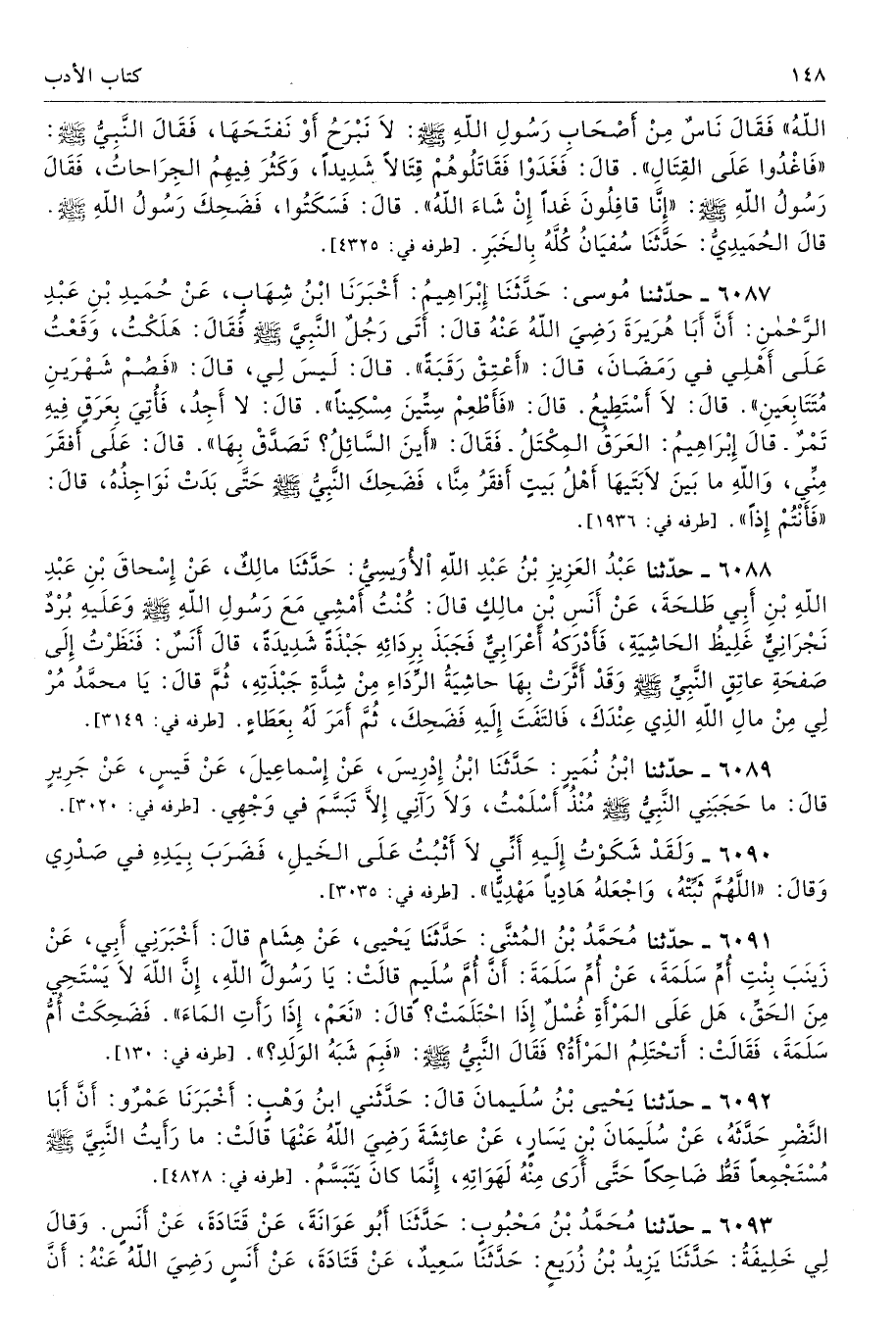 6088 - حَدَّثَنَا عَبْدُ الْعَزِيزِ بْنُ عَبْدِ اللَّهِ الأُوَيْسِىُّ حَدَّثَنَا مَالِكٌ عَنْ إِسْحَاقَ بْنِ عَبْدِ اللَّهِ بْنِ أَبِى طَلْحَةَ عَنْ أَنَسِ بْنِ مَالِكٍ قَالَ كُنْتُ أَمْشِى مَعَ رَسُولِ اللَّهِ - صلى الله عليه وسلم - وَعَلَيْهِ بُرْدٌ نَجْرَانِىٌّ غَلِيظُ الْحَاشِيَةِ، فَأَدْرَكَهُ أَعْرَابِىٌّ فَجَبَذَ بِرِدَائِهِ جَبْذَةً شَدِيدَةً - قَالَ أَنَسٌ فَنَظَرْتُ إِلَى صَفْحَةِ عَاتِقِ النَّبِىِّ - صلى الله عليه وسلم - وَقَدْ أَثَّرَتْ بِهَا حَاشِيَةُ الرِّدَاءِ مِنْ شِدَّةِ جَبْذَتِهِ - ثُمَّ قَالَ يَا مُحَمَّدُ مُرْ لِى مِنْ مَالِ اللَّهِ الَّذِى عِنْدَكَ. فَالْتَفَتَ إِلَيْهِ فَضَحِكَ، ثُمَّ أَمَرَ لَهُ بِعَطَاءٍ. طرفاه 3149، 5809 - تحفة 205