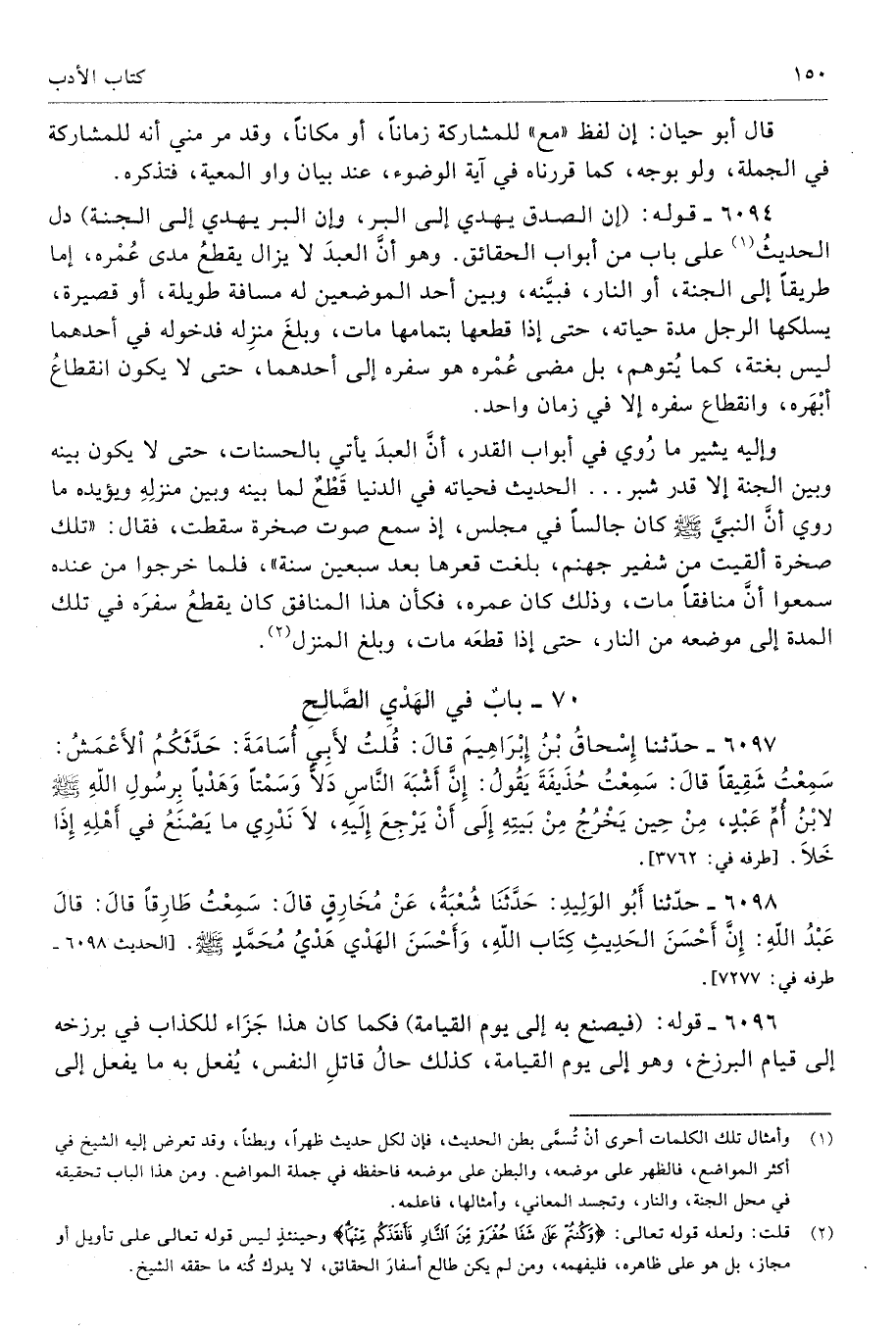 (¬1) وأمثال تلك الكلمات أحرى أنْ تُسمَّى بطن الحديث، فإن لكل حديث ظهرًا، وبطنًا، وقد تعرض إليه الشيخ في أكثر المواضع، فالظهر على موضعه، والبطن على موضعه فاحفظه في جملة المواضع. ومن هذا الباب تحقيقه في محل الجنة، والنار، وتجسد المعاني، وأمثالها، فاعلمه.