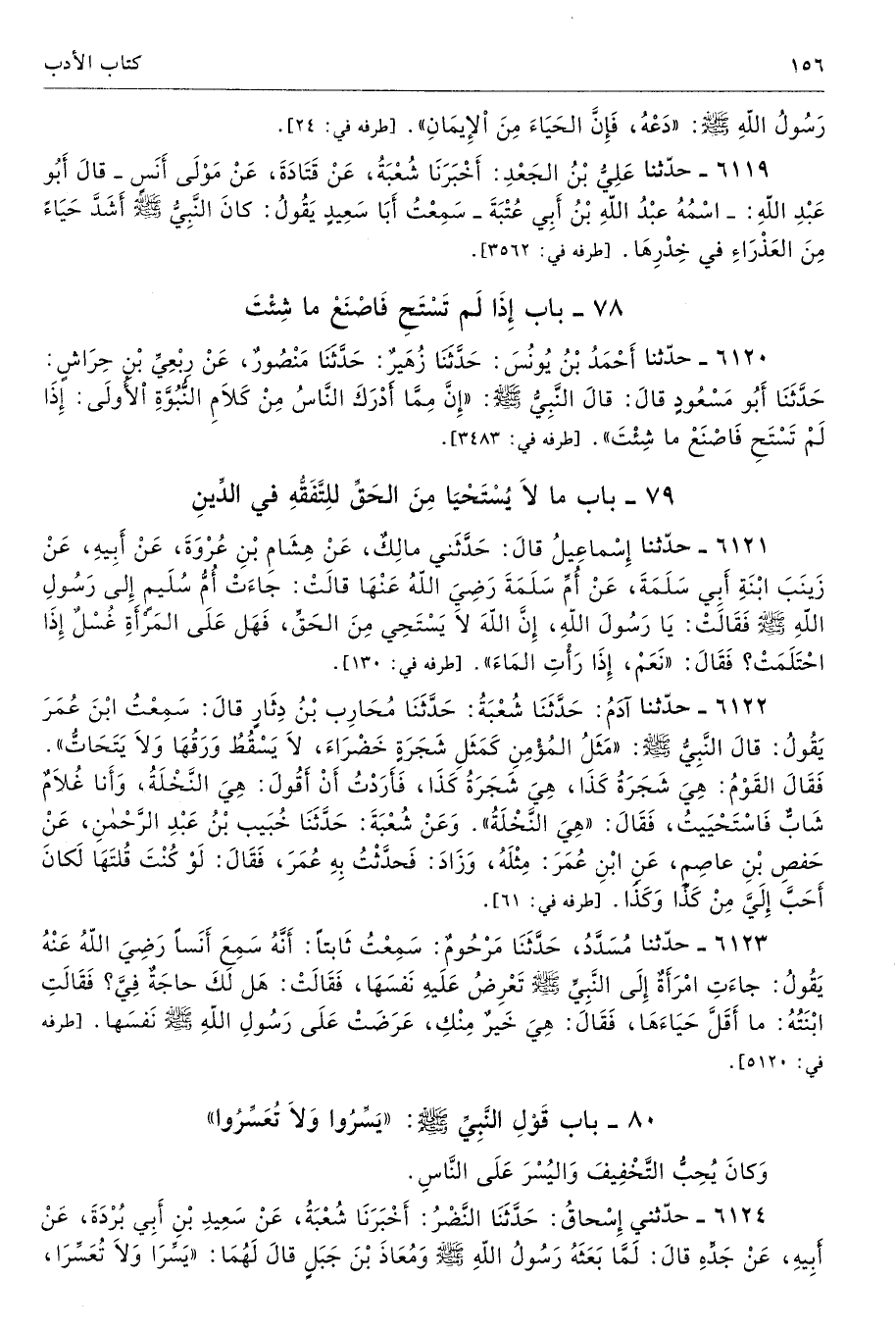 6119 - حَدَّثَنَا عَلِىُّ بْنُ الْجَعْدِ أَخْبَرَنَا شُعْبَةُ عَنْ قَتَادَةَ عَنْ مَوْلَى أَنَسٍ - قَالَ أَبُو عَبْدِ اللَّهِ اسْمُهُ عَبْدُ اللَّهِ بْنُ أَبِى عُتْبَةَ - سَمِعْتُ أَبَا سَعِيدٍ يَقُولُ كَانَ النَّبِىُّ - صلى الله عليه وسلم - أَشَدَّ حَيَاءً مِنَ الْعَذْرَاءِ فِى خِدْرِهَا. طرفاه 3562، 6102 - تحفة 4107