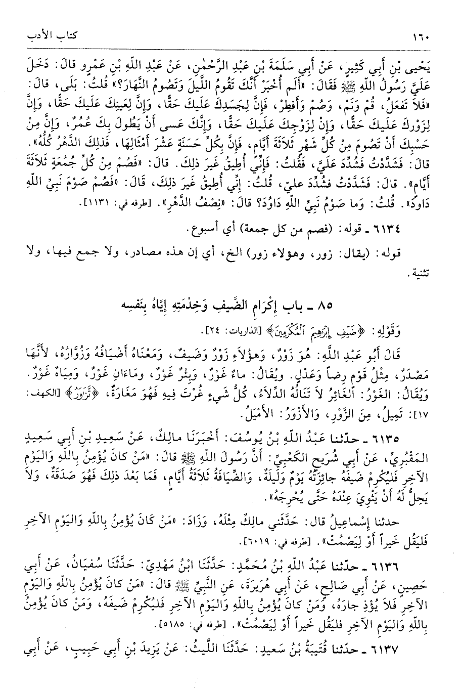 يَحْيَى بْنِ أَبِى كَثِيرٍ عَنْ أَبِى سَلَمَةَ بْنِ عَبْدِ الرَّحْمَنِ عَنْ عَبْدِ اللَّهِ بْنِ عَمْرٍو قَالَ دَخَلَ عَلَىَّ رَسُولُ اللَّهِ - صلى الله عليه وسلم - فَقَالَ «أَلَمْ أُخْبَرْ أَنَّكَ تَقُومُ اللَّيْلَ وَتَصُومُ النَّهَارَ». قُلْتُ بَلَى. قَالَ «فَلاَ تَفْعَلْ، قُمْ وَنَمْ، وَصُمْ وَأَفْطِرْ، فَإِنَّ لِجَسَدِكَ عَلَيْكَ حَقًّا، وَإِنَّ لِعَيْنِكَ عَلَيْكَ حَقًّا، وَإِنَّ لِزَوْرِكَ عَلَيْكَ حَقًّا، وَإِنَّ لِزَوْجِكَ عَلَيْكَ حَقًّا، وَإِنَّكَ عَسَى أَنْ يَطُولَ بِكَ عُمُرٌ، وَإِنَّ مِنْ حَسْبِكَ أَنْ تَصُومَ مِنْ كُلِّ شَهْرٍ ثَلاَثَةَ أَيَّامٍ، فَإِنَّ بِكُلِّ حَسَنَةٍ عَشْرَ أَمْثَالِهَا فَذَلِكَ الدَّهْرُ كُلُّهُ». قَالَ فَشَدَّدْتُ فَشُدِّدَ عَلَىَّ فَقُلْتُ فَإِنِّى أُطِيقُ غَيْرَ ذَلِكَ. قَالَ «فَصُمْ مِنْ كُلِّ جُمُعَةٍ ثَلاَثَةَ أَيَّامٍ». قَالَ فَشَدَّدْتُ فَشُدِّدَ عَلَىَّ قُلْتُ أُطِيقُ غَيْرَ ذَلِكَ. قَالَ «فَصُمْ صَوْمَ نَبِىِّ اللَّهِ دَاوُدَ». قُلْتُ وَمَا صَوْمُ نَبِىِّ اللَّهِ دَاوُدَ قَالَ «نِصْفُ الدَّهْرِ». أطرافه 1131، 1152، 1153، 1974، 1975، 1976، 1977، 1978، 1979، 1980، 3418، 3419، 3420، 5052، 5053، 5054، 5199، 6277 تحفة 8960 - 39/ 8
