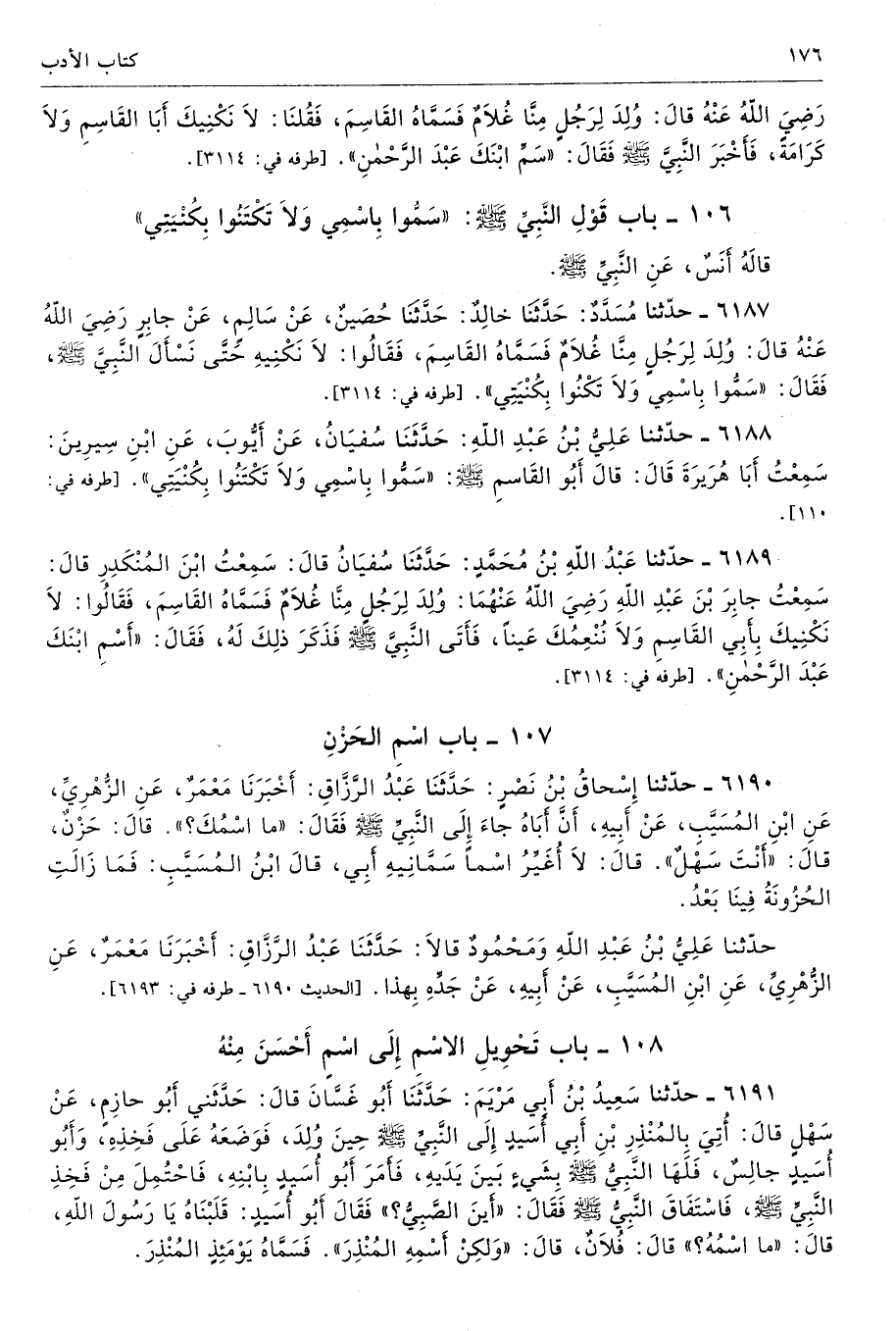 6189 - حَدَّثَنَا عَبْدُ اللَّهِ بْنُ مُحَمَّدٍ حَدَّثَنَا سُفْيَانُ قَالَ سَمِعْتُ ابْنَ الْمُنْكَدِرِ قَالَ سَمِعْتُ جَابِرَ بْنَ عَبْدِ اللَّهِ - رضى الله عنهما وُلِدَ لِرَجُلٍ مِنَّا غُلاَمٌ فَسَمَّاهُ الْقَاسِمَ فَقَالُوا لاَ نَكْنِيكَ بِأَبِى الْقَاسِمِ، وَلاَ نُنْعِمُكَ عَيْنًا. فَأَتَى النَّبِىَّ - صلى الله عليه وسلم - فَذَكَرَ ذَلِكَ لَهُ فَقَالَ «أَسْمِ ابْنَكَ عَبْدَ الرَّحْمَنِ». أطرافه 3114، 3115، 3538، 6186، 6187، 6196 - تحفة 3034