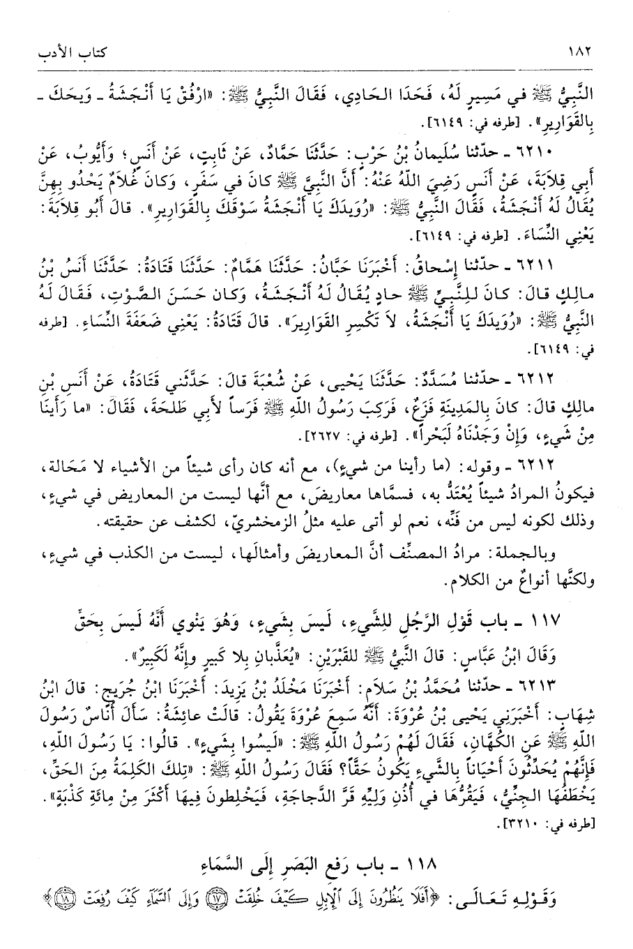 النَّبِىُّ - صلى الله عليه وسلم - فِى مَسِيرٍ لَهُ فَحَدَا الْحَادِى، فَقَالَ النَّبِىُّ - صلى الله عليه وسلم - «ارْفُقْ يَا أَنْجَشَةُ، وَيْحَكَ، بِالْقَوَارِيرِ». أطرافه 6149، 6161، 6202، 6210، 6211 - تحفة 443