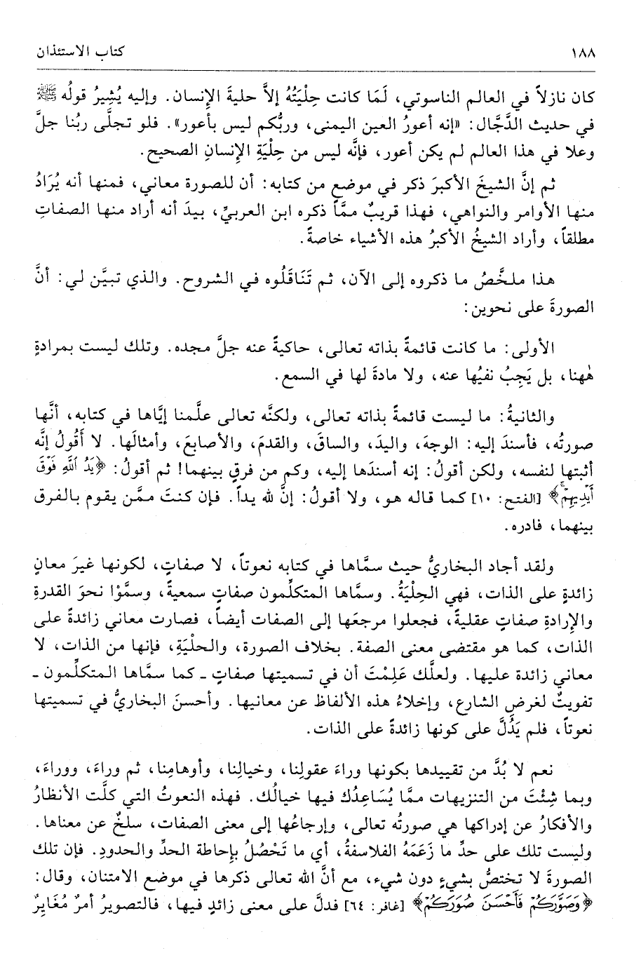 ولقد أجاد البخاريُّ حيث سمَّاها في كتابه نعوتًا، لا صفاتٍ، لكونها غيرَ معانٍ زائدةٍ على الذات، فهي الحِلْيَةُ. وسمَّاها المتكلِّمون صفاتٍ سمعيةً، وسمَّوْا نحوَ القدرةِ والإِرادةِ صفاتٍ عقليةً، فجعلوا مرجعَها إلى الصفات أيضًا، فصارت معاني زائدةً على الذات، كما هو مقتضى معنى الصفة. بخلاف الصورة، والحلْيَةِ، فإنها من الذات، لا معاني زائدة عليها. ولعلَّك عَلِمْتَ أن في تسميتها صفاتٍ - كما سمَّاها المتكلِّمون تفويتٌ لغرضِ الشارع، وإخلاءُ هذه الألفاظ عن معانيها. وأحسنَ البخاريُّ في تسميتها نعوتًا، فلم يَدُلَّ على كونها زائدةً على الذات.