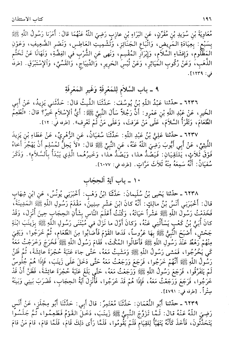 6238 - حَدَّثَنَا يَحْيَى بْنُ سُلَيْمَانَ حَدَّثَنَا ابْنُ وَهْبٍ أَخْبَرَنِى يُونُسُ عَنِ ابْنِ شِهَابٍ قَالَ أَخْبَرَنِى أَنَسُ بْنُ مَالِكٍ أَنَّهُ كَانَ ابْنَ عَشْرِ سِنِينَ مَقْدَمَ رَسُولِ اللَّهِ - صلى الله عليه وسلم - الْمَدِينَةَ، فَخَدَمْتُ رَسُولَ اللَّهِ - صلى الله عليه وسلم - عَشْرًا حَيَاتَهُ، وَكُنْتُ أَعْلَمَ النَّاسِ بِشَأْنِ الْحِجَابِ حِينَ أُنْزِلَ، وَقَدْ كَانَ أُبَىُّ بْنُ كَعْبٍ يَسْأَلُنِى عَنْهُ، وَكَانَ أَوَّلَ مَا نَزَلَ فِى مُبْتَنَى رَسُولِ اللَّهِ - صلى الله عليه وسلم - بِزَيْنَبَ ابْنَةِ جَحْشٍ، أَصْبَحَ النَّبِىُّ - صلى الله عليه وسلم - بِهَا عَرُوسًا فَدَعَا الْقَوْمَ، فَأَصَابُوا مِنَ الطَّعَامِ ثُمَّ خَرَجُوا، وَبَقِىَ مِنْهُمْ رَهْطٌ عِنْدَ رَسُولِ اللَّهِ - صلى الله عليه وسلم - فَأَطَالُوا الْمُكْثَ فَقَامَ رَسُولُ اللَّهِ - صلى الله عليه وسلم - فَخَرَجَ وَخَرَجْتُ مَعَهُ كَىْ يَخْرُجُوا، فَمَشَى رَسُولُ اللَّهِ - صلى الله عليه وسلم - وَمَشَيْتُ مَعَهُ حَتَّى جَاءَ عَتَبَةَ حُجْرَةِ عَائِشَةَ، ثُمَّ ظَنَّ رَسُولُ اللَّهِ - صلى الله عليه وسلم - أَنَّهُمْ خَرَجُوا فَرَجَعَ وَرَجَعْتُ مَعَهُ، حَتَّى دَخَلَ عَلَى زَيْنَبَ فَإِذَا هُمْ جُلُوسٌ لَمْ يَتَفَرَّقُوا، فَرَجَعَ رَسُولُ اللَّهِ - صلى الله عليه وسلم - وَرَجَعْتُ مَعَهُ، حَتَّى بَلَغَ عَتَبَةَ حُجْرَةِ عَائِشَةَ، فَظَنَّ أَنْ قَدْ خَرَجُوا، فَرَجَعَ وَرَجَعْتُ مَعَهُ، فَإِذَا هُمْ قَدْ خَرَجُوا، فَأُنْزِلَ آيَةُ الْحِجَابِ، فَضَرَبَ بَيْنِى وَبَيْنَهُ سِتْرًا. أطرافه 4791، 4792، 4793، 4794، 5154، 5163، 5166، 5168، 5170، 5171، 5466، 6239، 6271، 7421 - تحفة 1563 - 66/ 8