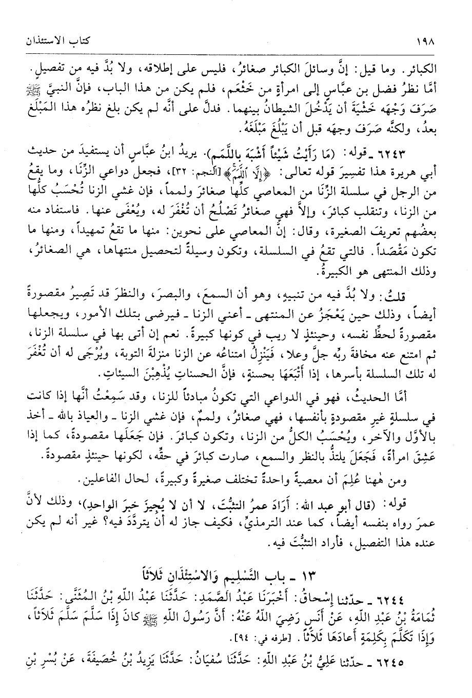 الكبائر. وما قيل: إنَّ وسائلَ الكبائر صغائرُ، فليس على إطلاقه، ولا بُدَّ فيه من تفصيلٍ. أمَّا نظرُ فضل بن عبَّاسٍ إلى امرأةٍ من خَثْعَم، فلم يكن من هذا الباب، فإنَّ النبيَّ صلى الله عليه وسلّم صَرَفَ وَجْهَه خَشْيَةَ أن يَدْخُلَ الشيطانُ بينهما. فدلَّ على أنَّه لم يكن بلغ نظرُه هذا المَبْلَغ بعدُ، ولكنَّه صَرَفَ وجهَه قبل أن يَبْلُغَ مَبْلَغَهُ.