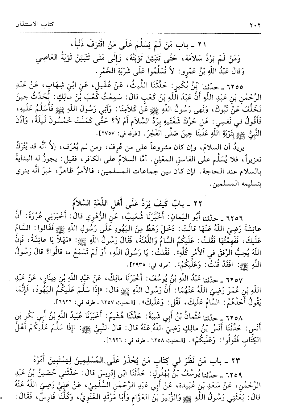 6258 - حَدَّثَنَا عُثْمَانُ بْنُ أَبِى شَيْبَةَ حَدَّثَنَا هُشَيْمٌ أَخْبَرَنَا عُبَيْدُ اللَّهِ بْنُ أَبِى بَكْرِ بْنِ أَنَسٍ حَدَّثَنَا أَنَسُ بْنُ مَالِكٍ - رضى الله عنه - قَالَ قَالَ النَّبِىُّ - صلى الله عليه وسلم - «إِذَا سَلَّمَ عَلَيْكُمْ أَهْلُ الْكِتَابِ فَقُولُوا وَعَلَيْكُمْ». طرفه 6926 - تحفة 1081