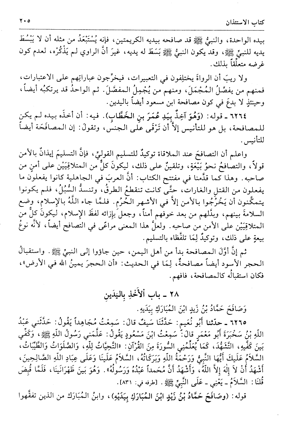 ولا ريبَ أن الرواةَ يختلِفون في التعبيرات، فيخرِّجون عباراتِهم على الاعتبارت، فمنهم من يفصِّلُ المُجْمَلَ، ومنهم من يُجْمِلُ المفصَّلَ. ثم الواحدُ قد يرتكبُه أيضًا، وحينئذٍ لا بدعَ في كون مصافحة ابن مسعود أيضًا باليدين.