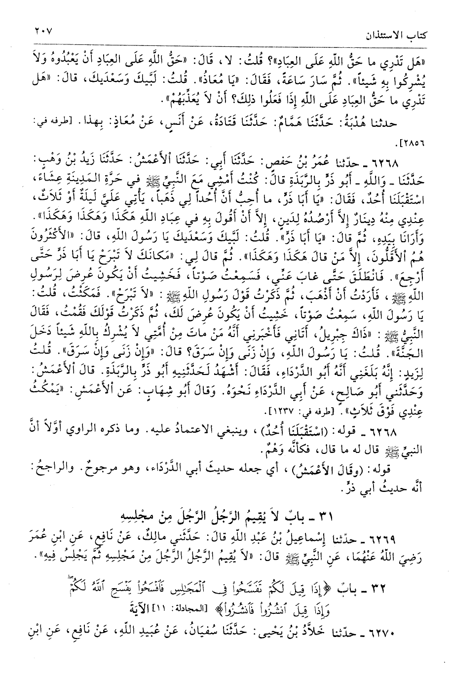 «هَلْ تَدْرِى مَا حَقُّ اللَّهِ عَلَى الْعِبَادِ أَنْ يَعْبُدُوهُ وَلاَ يُشْرِكُوا بِهِ شَيْئًا». ثُمَّ سَارَ سَاعَةً فَقَالَ «يَا مُعَاذُ». قُلْتُ لَبَّيْكَ وَسَعْدَيْكَ. قَالَ «هَلْ تَدْرِى مَا حَقُّ الْعِبَادِ عَلَى اللَّهِ إِذَا فَعَلُوا ذَلِكَ أَنْ لاَ يُعَذِّبَهُمْ». أطرافه 2856، 5967، 6500، 7373 - تحفة 11308