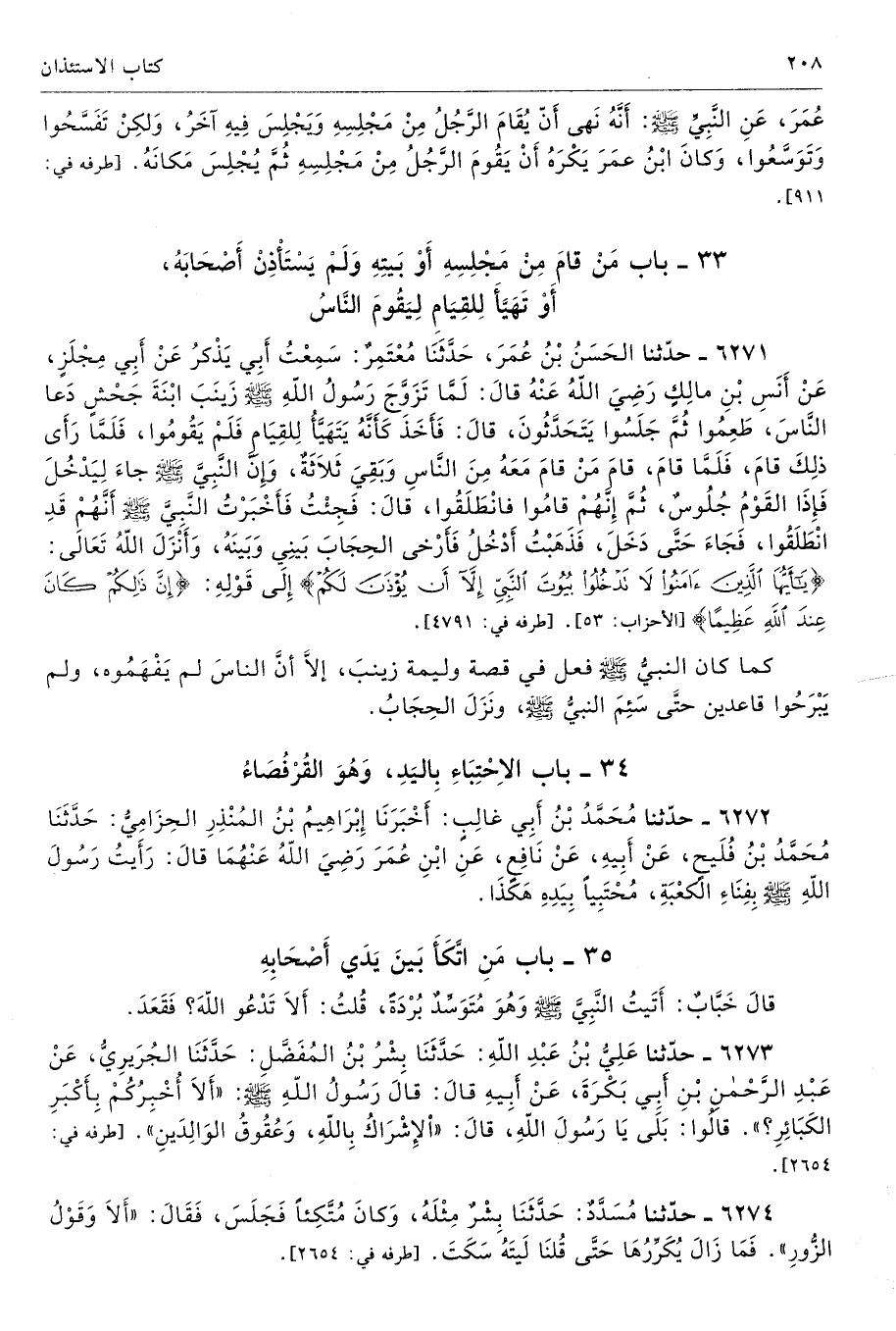 6271 - حَدَّثَنَا الْحَسَنُ بْنُ عُمَرَ حَدَّثَنَا مُعْتَمِرٌ سَمِعْتُ أَبِى يَذْكُرُ عَنْ أَبِى مِجْلَزٍ عَنْ أَنَسِ بْنِ مَالِكٍ - رضى الله عنه - قَالَ لَمَّا تَزَوَّجَ رَسُولُ اللَّهِ - صلى الله عليه وسلم - زَيْنَبَ ابْنَةَ جَحْشٍ دَعَا النَّاسَ طَعِمُوا ثُمَّ جَلَسُوا يَتَحَدَّثُونَ - قَالَ - فَأَخَذَ كَأَنَّهُ يَتَهَيَّأُ لِلْقِيَامِ فَلَمْ يَقُومُوا، فَلَمَّا رَأَى ذَلِكَ قَامَ، فَلَمَّا قَامَ قَامَ مَنْ قَامَ مَعَهُ مِنَ النَّاسِ، وَبَقِىَ ثَلاَثَةٌ، وَإِنَّ النَّبِىَّ - صلى الله عليه وسلم - جَاءَ لِيَدْخُلَ فَإِذَا الْقَوْمُ جُلُوسٌ، ثُمَّ إِنَّهُمْ قَامُوا فَانْطَلَقُوا - قَالَ - فَجِئْتُ فَأَخْبَرْتُ النَّبِىَّ - صلى الله عليه وسلم - أَنَّهُمْ قَدِ انْطَلَقُوا، فَجَاءَ حَتَّى دَخَلَ فَذَهَبْتُ أَدْخُلُ، فَأَرْخَى الْحِجَابَ بَيْنِى وَبَيْنَهُ، وَأَنْزَلَ اللَّهُ تَعَالَى {يَا أَيُّهَا الَّذِينَ آمَنُوا لَا تَدْخُلُوا بُيُوتَ النَّبِيِّ إِلَّا أَنْ يُؤْذَنَ لَكُمْ} إِلَى قَوْلِهِ {إِنَّ ذَلِكُمْ كَانَ عِنْدَ اللَّهِ عَظِيمًا (53)} [الأحزاب: 53]. أطرافه 4791، 4792، 4793، 4794، 5154، 5163، 5166، 5168، 5170، 5171، 5466، 6238، 6239، 7421 - تحفة 1651 - 76/ 8