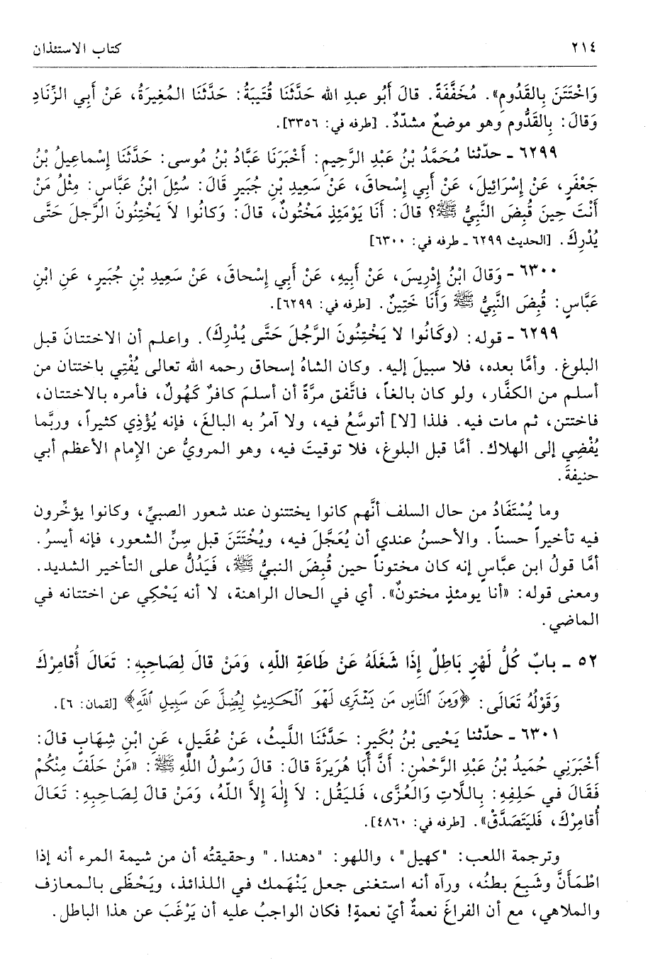 6299 - حَدَّثَنَا مُحَمَّدُ بْنُ عَبْدِ الرَّحِيمِ أَخْبَرَنَا عَبَّادُ بْنُ مُوسَى حَدَّثَنَا إِسْمَاعِيلُ بْنُ جَعْفَرٍ عَنْ إِسْرَائِيلَ عَنْ أَبِى إِسْحَاقَ عَنْ سَعِيدِ بْنِ جُبَيْرٍ قَالَ سُئِلَ ابْنُ عَبَّاسٍ مِثْلُ مَنْ أَنْتَ حِينَ قُبِضَ النَّبِىُّ - صلى الله عليه وسلم - قَالَ أَنَا يَوْمَئِذٍ مَخْتُونٌ. قَالَ وَكَانُوا لاَ يَخْتِنُونَ الرَّجُلَ حَتَّى يُدْرِكَ. طرفه 6300 - تحفة 5589